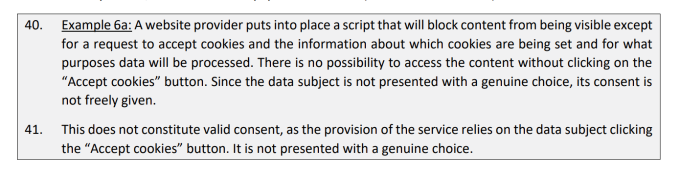EDPBの文書には下の例が含まれており、Cookieウォールへの同意は「サービスの供給が、データ主体による『Cookieを受け入れる』のクリックに依存しているため、有効な同意とはならない。自由意志による選択とは見なされない」という要点を表している。