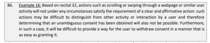 今回の改訂された指導の注目すべき第二の点に、EDPBがさらなる明確化が必要と判断したことから提示された、スクロールと同意の問題がある。