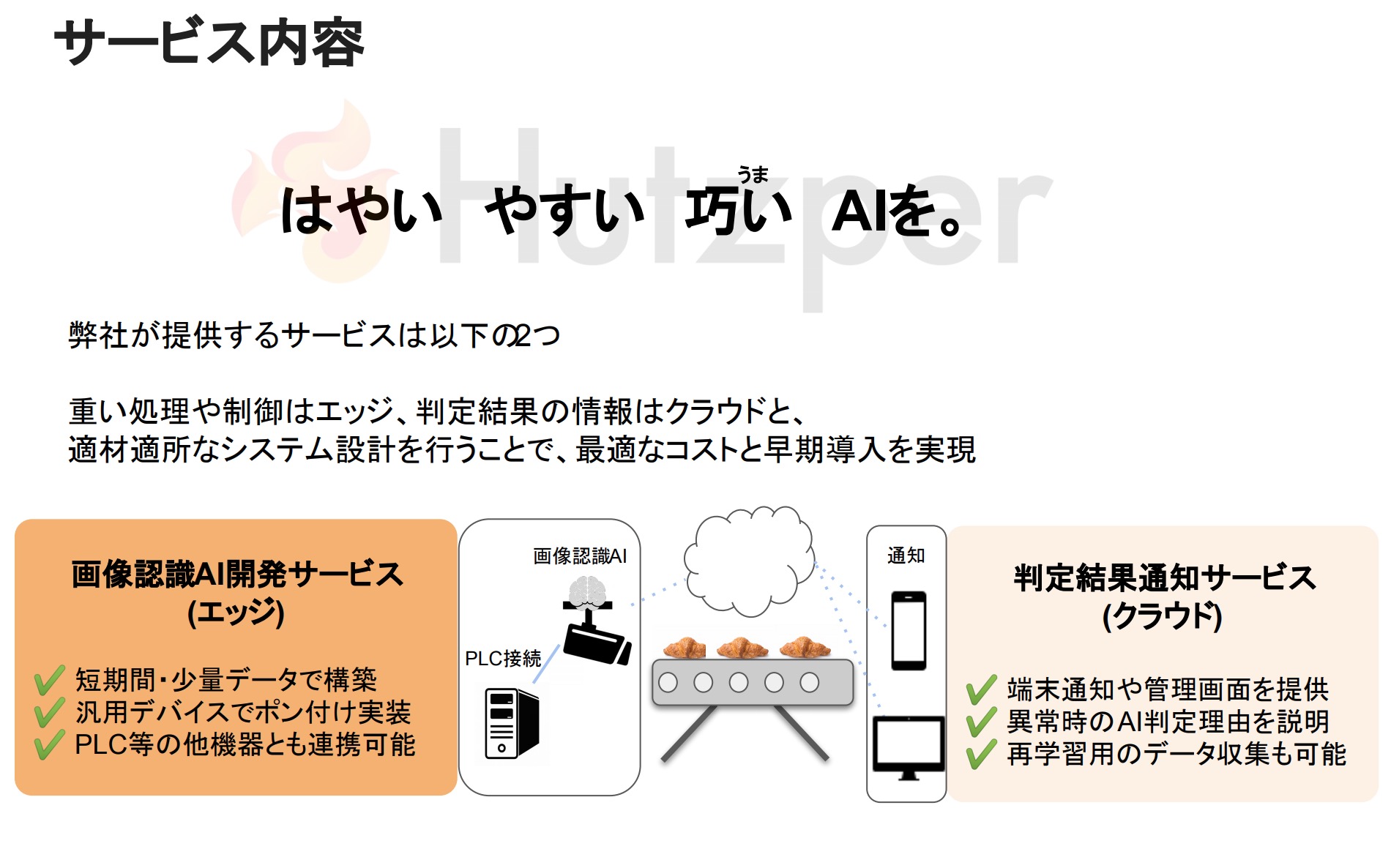 フツパーでは上述した通り既存のものを組み合わせることでデバイス、モデル作成、実装込みで数百万円前半から導入できる仕組みを構築。判定結果を通知するSaaS型のクラウドサービスも月額数万円から使えるようにした。