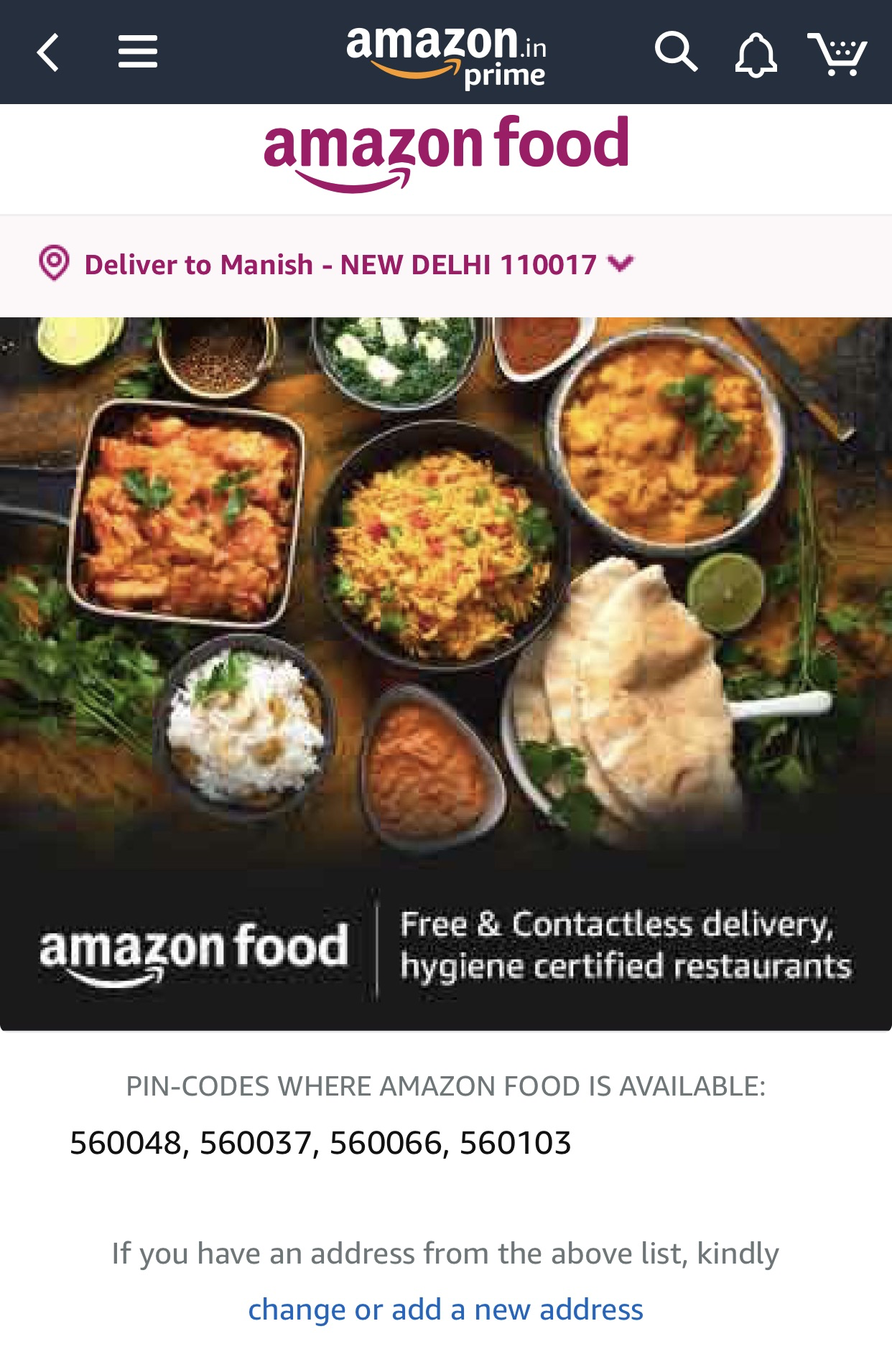 「Amazon」アプリを通じて利用できるAmazon Foodは現在バンガロール郊外のベランダ、ハラルアー、マラサハリ、ホワイトフィールドで展開されている