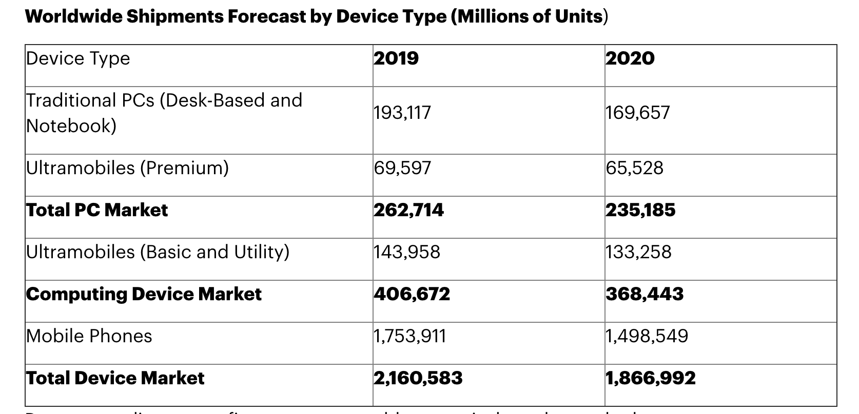 新型コロナウイルス(COVID-19)は当然のことながら、減少の大きな原因となる。社会のほぼすべての分野に新型コロナウイルスは影響を与えており、ハードウェアも例外ではない。携帯電話は2019年比で14.6%減と、最大の打撃が予測されている。このリストにはフィーチャーフォンとスマートフォンの両方が含まれており、そのうち後者がほとんどを構成する。スマートフォンでは、前年比13.7%減となる。