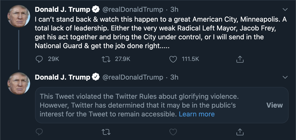 関連記事:Twitterが「暴力を称える内容」とトランプ大統領のミネアポリスに関するツイートに再び警告