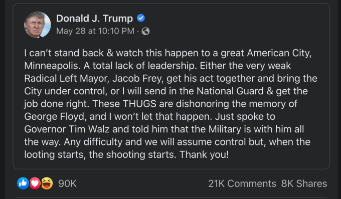 先週、武器を持たない黒人、フロイド氏を警官が死亡させたことに抗議するデモがミネアポリスで行われている中、トランプ大統領はTwitter(ツイッター)とFacebookの両方に、「略奪が始まれば、銃撃も始まる」と投稿した。