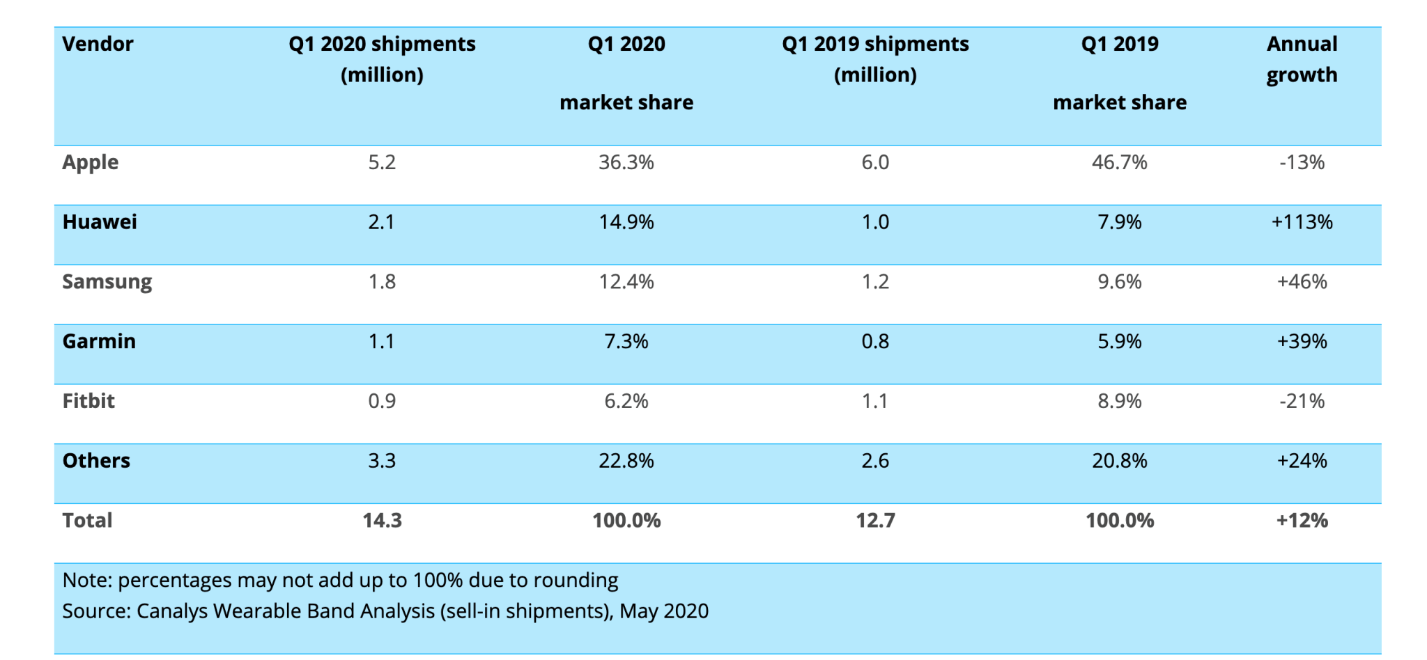新型コロナウイルスで世界的に経済が停滞する中で、ウェアラブルは驚くほど活発な部門であることが証明された。今月初めに報告したように、第1四半期のウェアラブル出荷の成長は緩やかになったものの、止まってはいなかった。多くのウェアラブル潜在ユーザーの追跡する歩数が少ないにもかかわらずだ。そして Canalysが米国6月17日に発表したデータによると、スマートウォッチ部門は引き続き成長していることが明らかになった。
