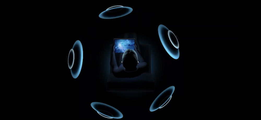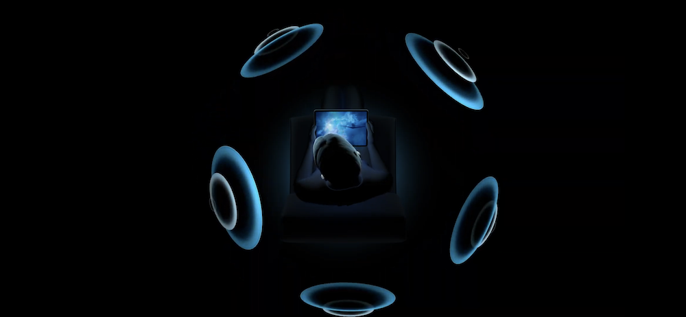 基調講演では、AirPods Proのソフトウェア(ファームウェア)を更新することで音の聞こえ方をユーザーの姿勢や端末の持ち方で自動的に調整できることが説明された。顔や端末を左に向けると、音が聞こえてくる方向が自動的に調整される。