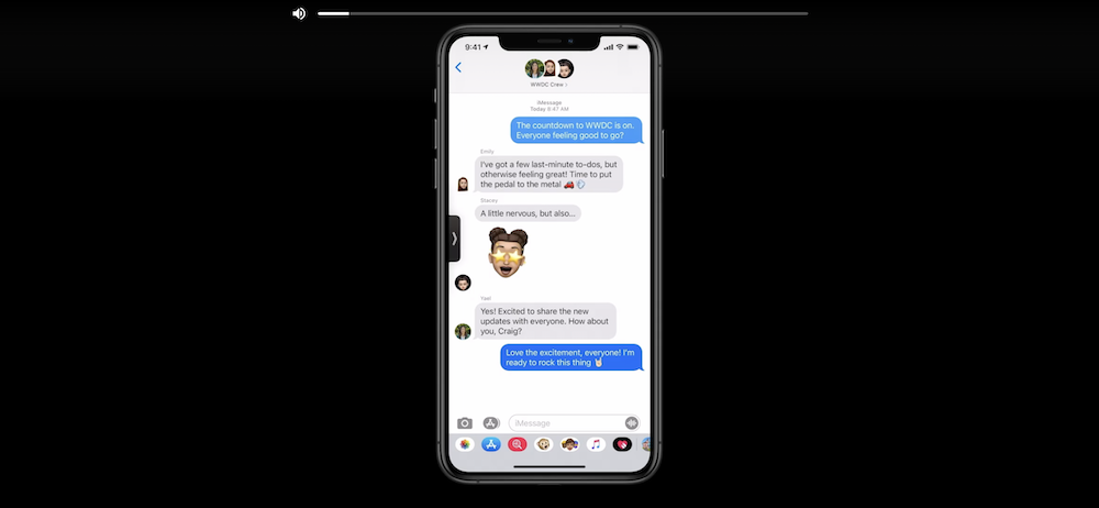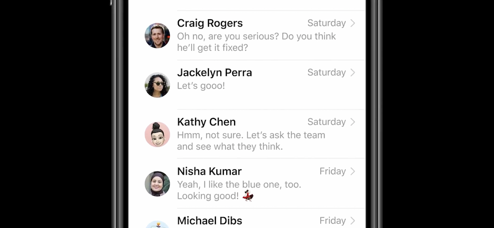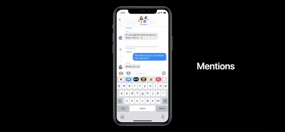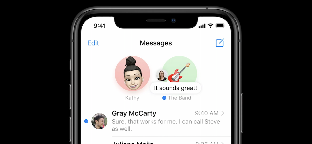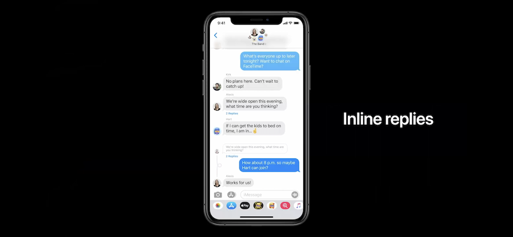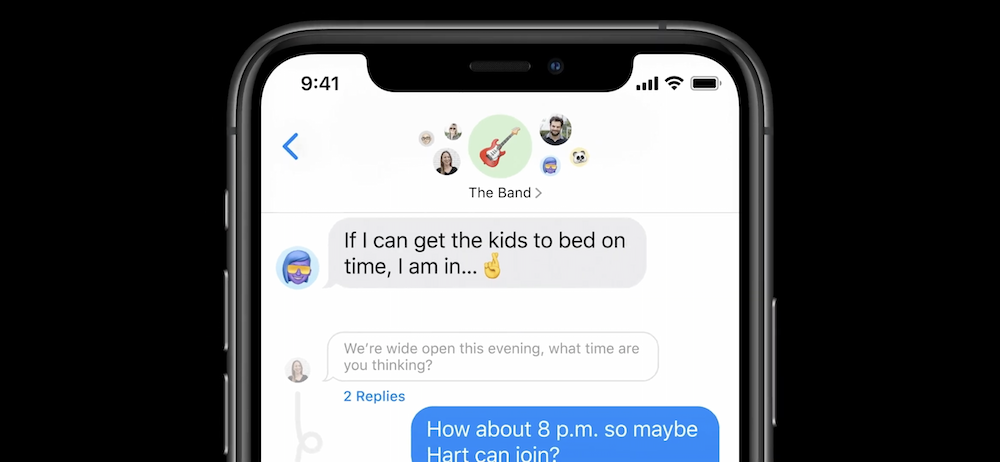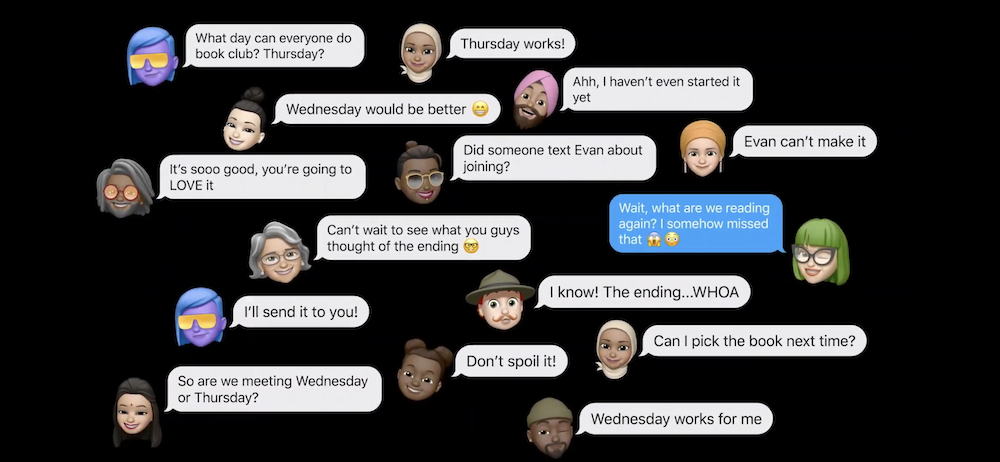 「メッセージ」アプリでは、特定の人物をピン留めして呼び出しやすくする機能やグループ化機能が搭載される。また、Memoji(ミー文字)の種類が大幅に増え、さまざな人種や容姿を表現できるようになった。実際の会話画面では、特定のメッセージ(吹き出し)に対して明示的に返信できるインライン・リプライ、グループチャットなどで特定の人物を明示してメッセージを送るメンションが利用可能だ。