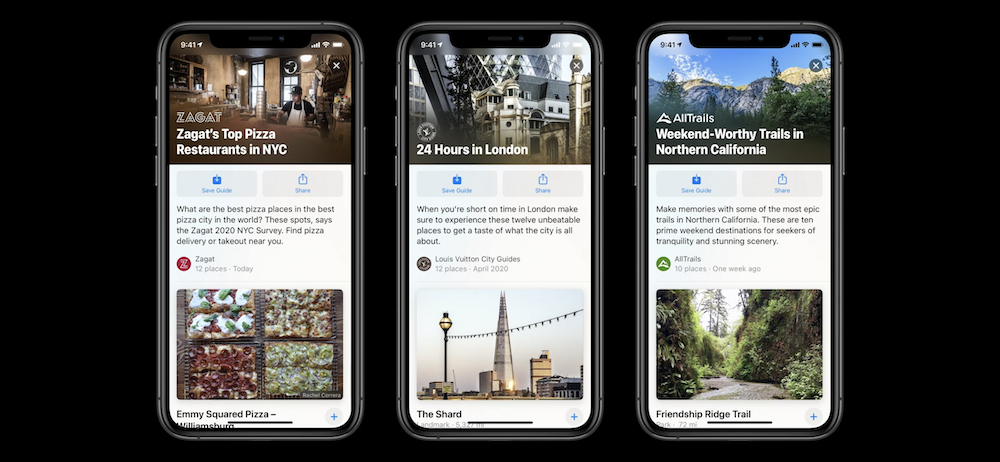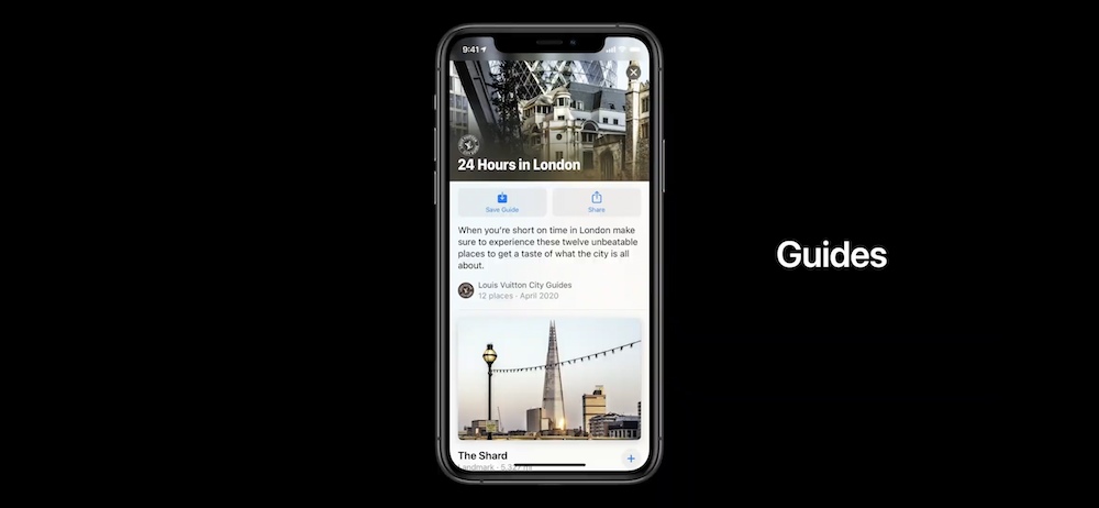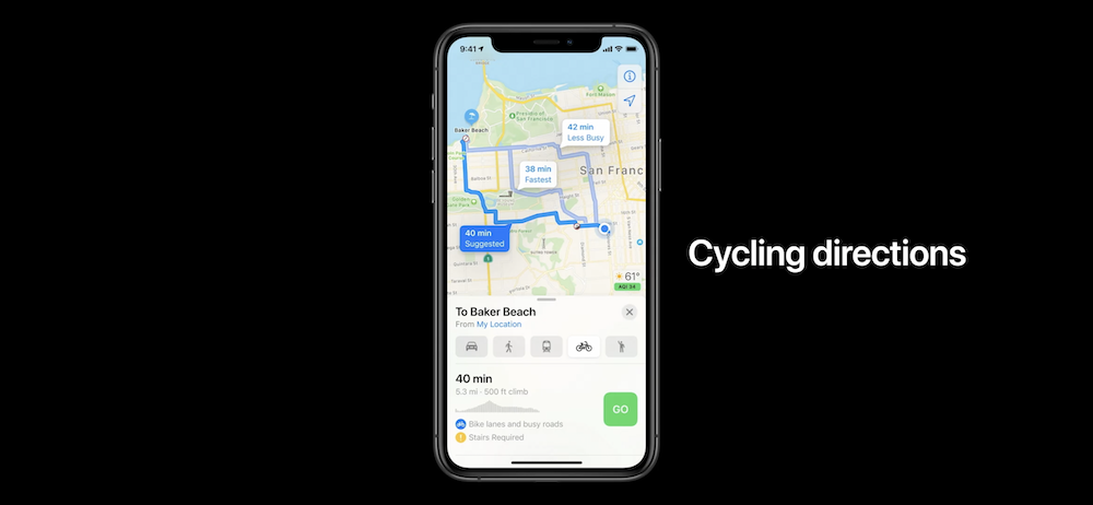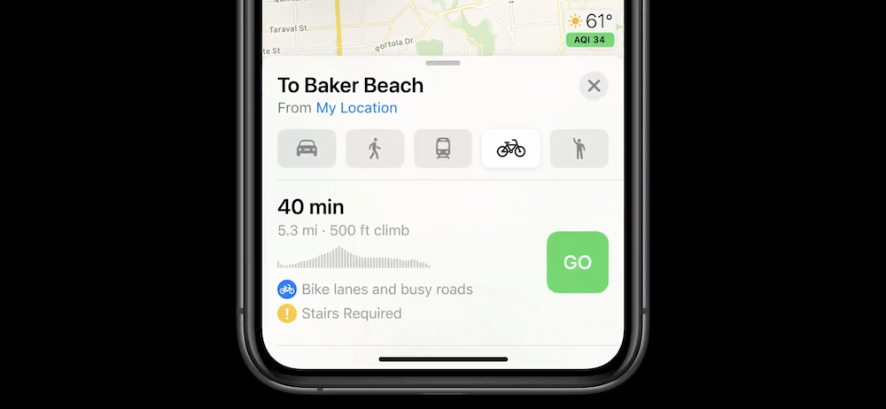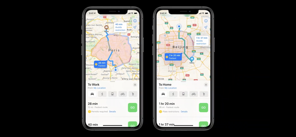 「マップ」アプリでは、Googleストリートビューのような実際の現地の写真を表示しながら場所を調べられるようになる。まずは、英国、アイルランド、カナダで利用可能だ。Guide(ガイド)機能も加わり、飲食店や名所などの情報をより簡単に呼び出せるようになる。また、Cycling directions(サイクリングの道順)は、その名のとおり自転車移動に適した経路を検索してくれる機能。勾配などのデータもチェック可能だ。こちらは米国のニューヨーク市、ロサンゼルス、サンフランシスコ・ベイエリア、上海、北京で利用できる。ほかの地域についても今後拡大予定となっている。自転車だけでなく、電気自動車向けのEV routingと呼ばれる機能もある。同機能では、充電ステーションの場所を含んだ経路などを検索可能だ。