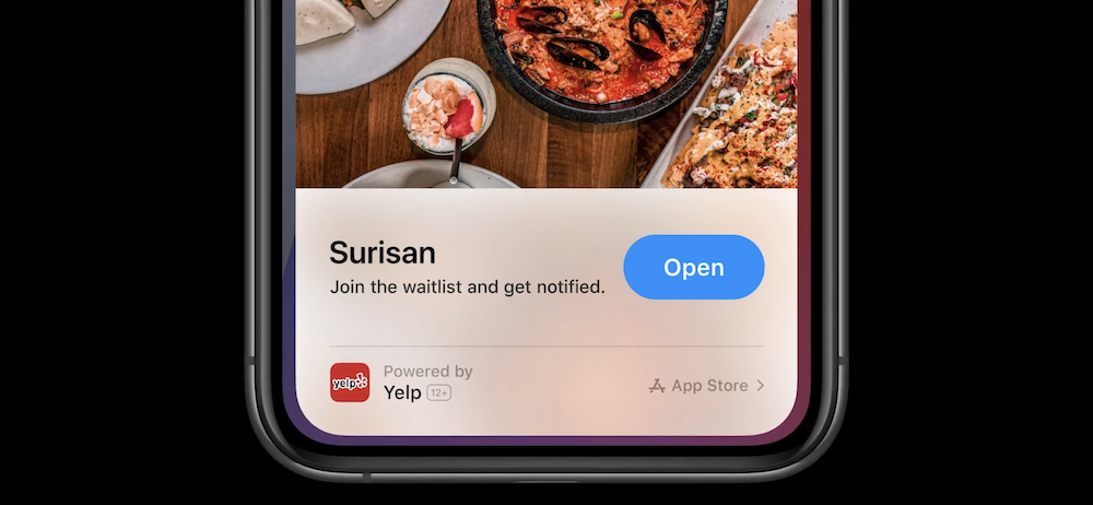 App StoreにはApp Clipという機能が搭載される。Safariや「メッセージ」アプリ、「マップ」アプリ内のリンク、NFCやQRコードなどから簡単にアプリをインストールできるようになる。具体的には、飲食店などの店頭でNFC端末を用意することで、自社アプリのインストールを来店者に画面上で促すことなどが可能だ。自社アプリがない場合でも、飲食店を検索できるYelpなどのアプリに含まれる、特定の店舗の情報をユーザーに提示するという方法もある。
