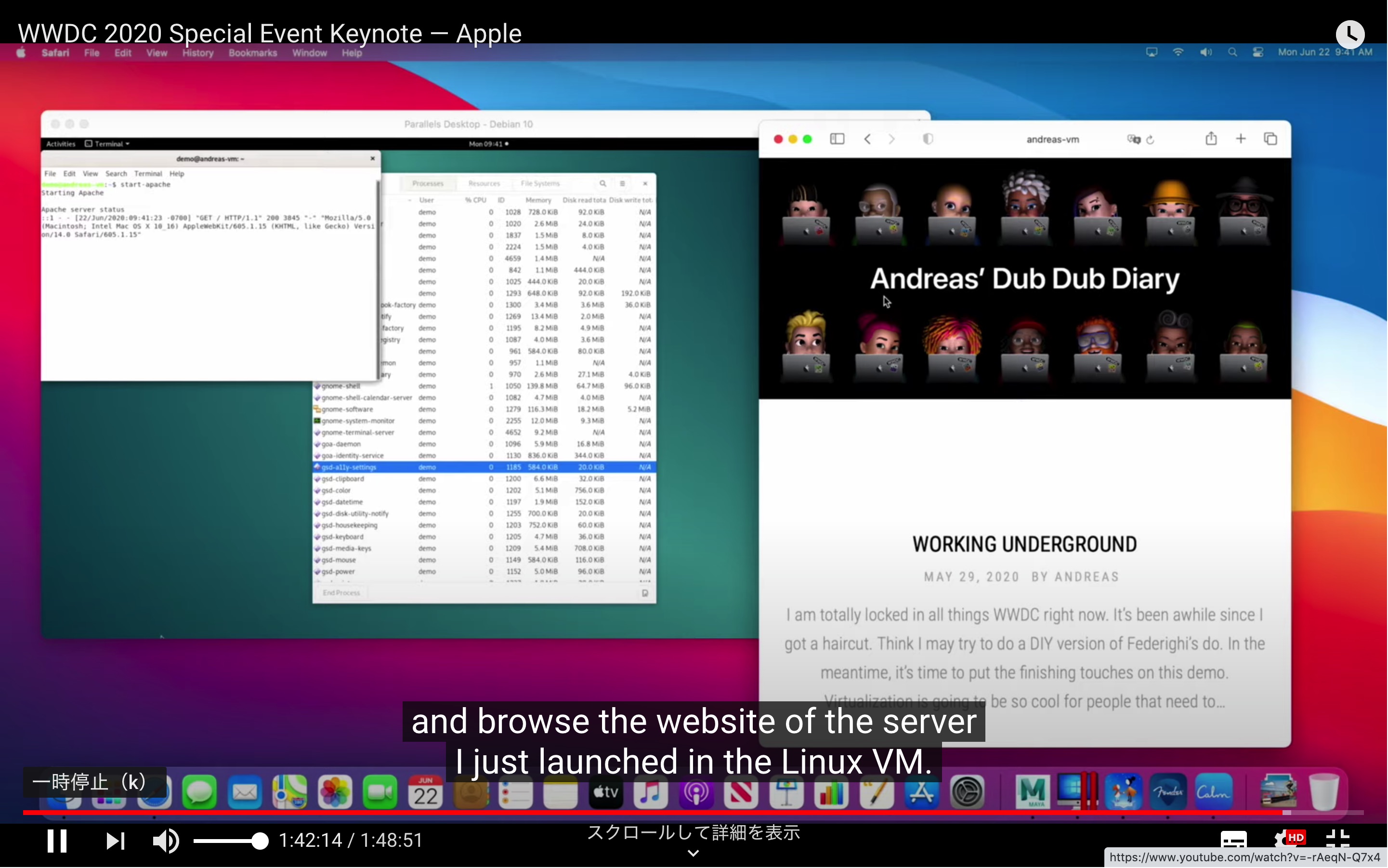 WWDC20の基調講演のデモでは、Apple Siliconに対応させたプロトタイプのParallels DesktopでDebian Linuxの仮想環境を構築し、その上でApacheサーバを稼働させていたが、Debianにはx64版のほか、x86版やARM版などさまざまなアーキテクチャに対応しているので、プロトタイプがx64ベースなのか、ARMベースなのかは判別できない。