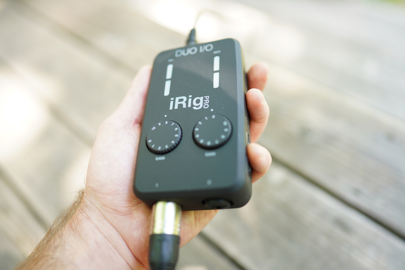 The iRig Pro Duoは、IK Multimediaのラインナップに新しく加わったiRig Proの上位機種であり、その名称からわかるように2つ目のXLR入力を備えている。それでもとても小型で持ち運びがしやすく、手の平にも乗るほどだ。電源は単三乾電池2本の内蔵式だが、USBまたは別売りの専用ACアダプターも利用できる。