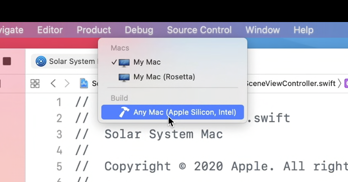 Xcodeでアプリをビルドする場合、そのXcodeが動作しているMacと同じアーキテクチャのネイティブコードをターゲットにビルドするには、単にそのMacの名前(この例では「My Mac」)を選べばいい。そして、Universal 2アプリをビルドするには、その選択を「Any Mac」に変更するだけ。それだけで、インテルとApple Silicon、2種類のCPUの実行コードを含んだユニバーサルアプリがビルドできる。