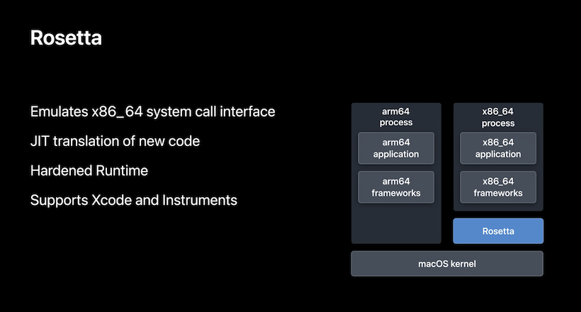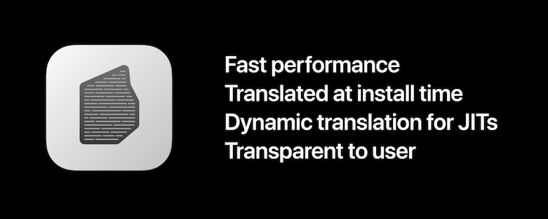 Rosetta 2についても、最初に紹介されたのはキーノートでだった。そこでは大きな特徴として、高性能かつ互換性が高いこと、アプリのコードはインストール時に変換されること、プラグインなどは実行直前にダイナミックに変換することも可能であること、ユーザーにとっては意識せずに動作することなどが挙げられた。