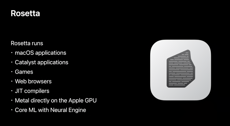 一方「Explore the new system architecture of Apple Silicon Macs」のセッションでは、比較的詳しい技術的内容も明らかにされた。まず示されたのは、Rosetta 2で動作可能なアプリの種類だ。一般的なmacOSのアプリはもちろん、Mac Catalystを利用して作られたアプリ、ゲーム、JavaScript用のJITコンパイラーなどを含むウェブブラウザーなどが挙げられた。Metalを利用したアプリでも、Rosetta 2によって適切なApple Silicon上のGPUコマンドが生成されるという。さらに、機械学習を扱うCoreMLフレームワークを利用したアプリでも、Apple Siliconに内蔵されるニューラルエンジンを利用して動作するようになる。