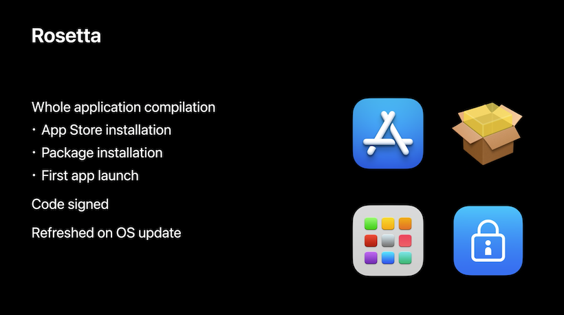次に、Rosetta 2によって実際のコードの変換が発生するタイミングについても説明された。それによると、1つは、App Storeからインストールするタイミング。もう1つは、どこからかダウンロードしたインストーラーのパッケージからインストールするタイミングだ。そして、こうしたアップル製の標準的なインストーラーを使わないアプリでも、初めて起動するタイミングで自動的に変換が実行される。その場合でも、最初だけDockの中でアプリのアイコンがバウンスする回数が多くなる程度だという。