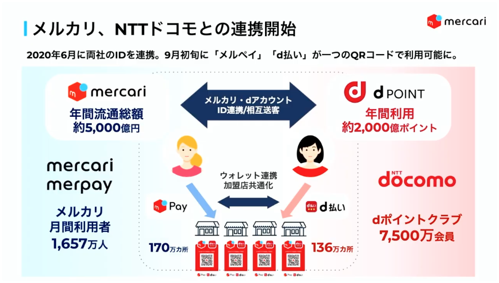メルカリは現在、月間のアクティブユーザー数が1650万人超、メルペイの利用者数は600万人超、メルペイ対応加盟店はコード決済、iD決済の合算で170万カ所となっている。