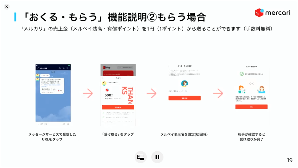 受け取り側はメッセージサービス内に記載されたリンクを開くことで受け取れる。不正使用を防ぐために、受け取り側は本人確認が必須となる。