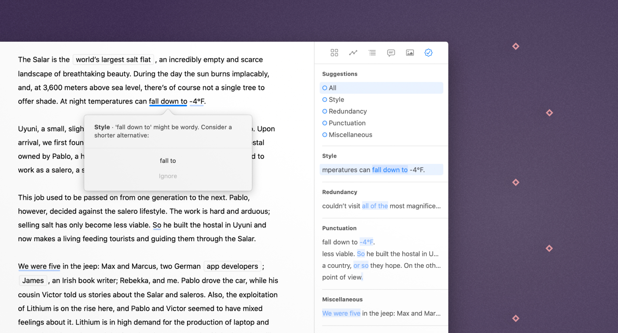 文法とスタイルのチェックは現時点ではMac版でのみ利用でき、iPhoneとiPadでは年内に利用できるようになる予定だ。