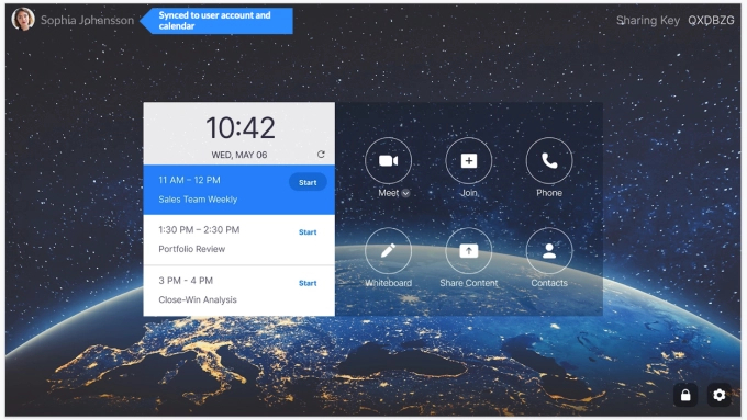 自分のカレンダーにリンクすると、サイドバーに会議の予定がすべて出る。これから始まる会議をタッチすると、それに接続される。この器具の画面をラップトップやスマホなどで共有することもできる。両者間の通信には超音波を使っている。Bluetoothに似ているが、電波ではなく人には聞こえない18〜22kHzの音波を使用する。