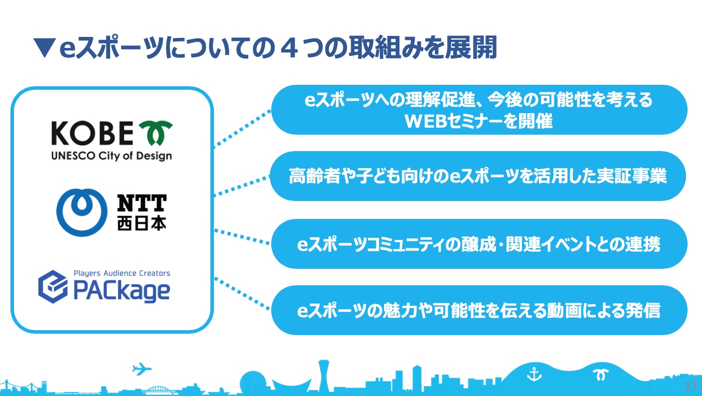 コミュニティの醸成については、PACKageが企画するものを含めた関連イベントと連携する。第1弾としてPACkageが参加する実行委員会が開催予定の「レインボーシックスシージ大学対抗戦 powered by AORUS」に神戸市が後援することが決まっている。動画配信については、開催予定のウェブセミナーや実証事業などの取り組みの様子、市内で活躍するeスポーツ関わる学生や市民などへのインタビューをまとめたものをコンテンツとして提供する予定だ。