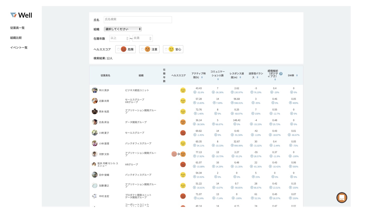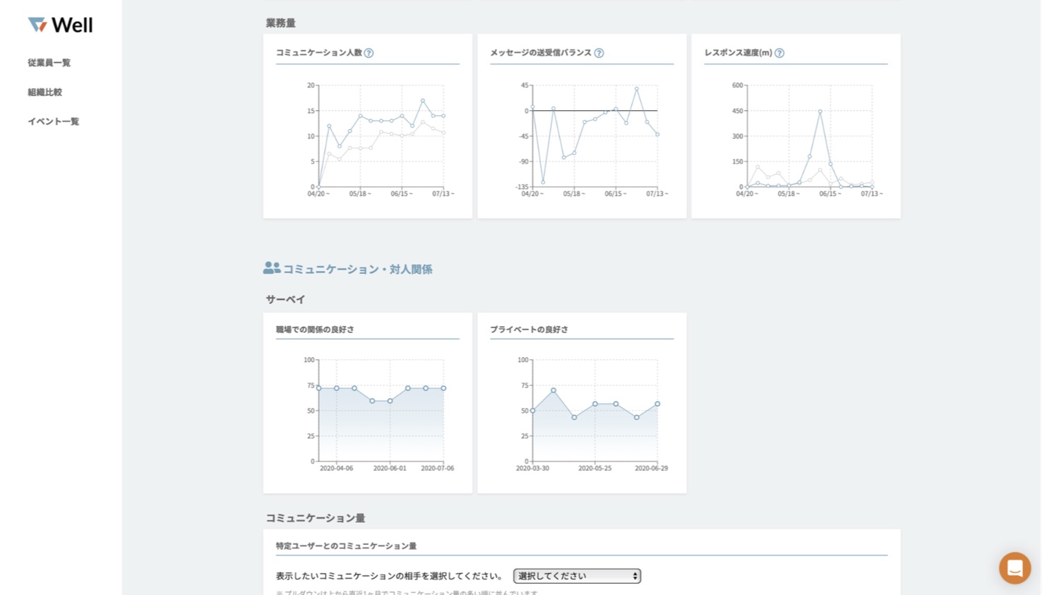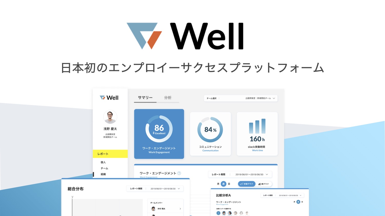 資金調達にあわせて、これまで一部企業にクローズドで提供していたWellのベータ版をパブリックベータとして一般公開する。Wellは、SlackやMicrosoft Teamsでの応答速度や内容などの行動データを機械学習で解析し、従業員や組織のコンディションを客観的かつリアルタイムに可視化できるのが特徴のSaaS。普段のメッセージのやり取りだけではわからない部分については、より調査が必要な従業員だけに向けてアンケート(サーベイ)を実施することで正確性・信憑性を補う仕組みだ。