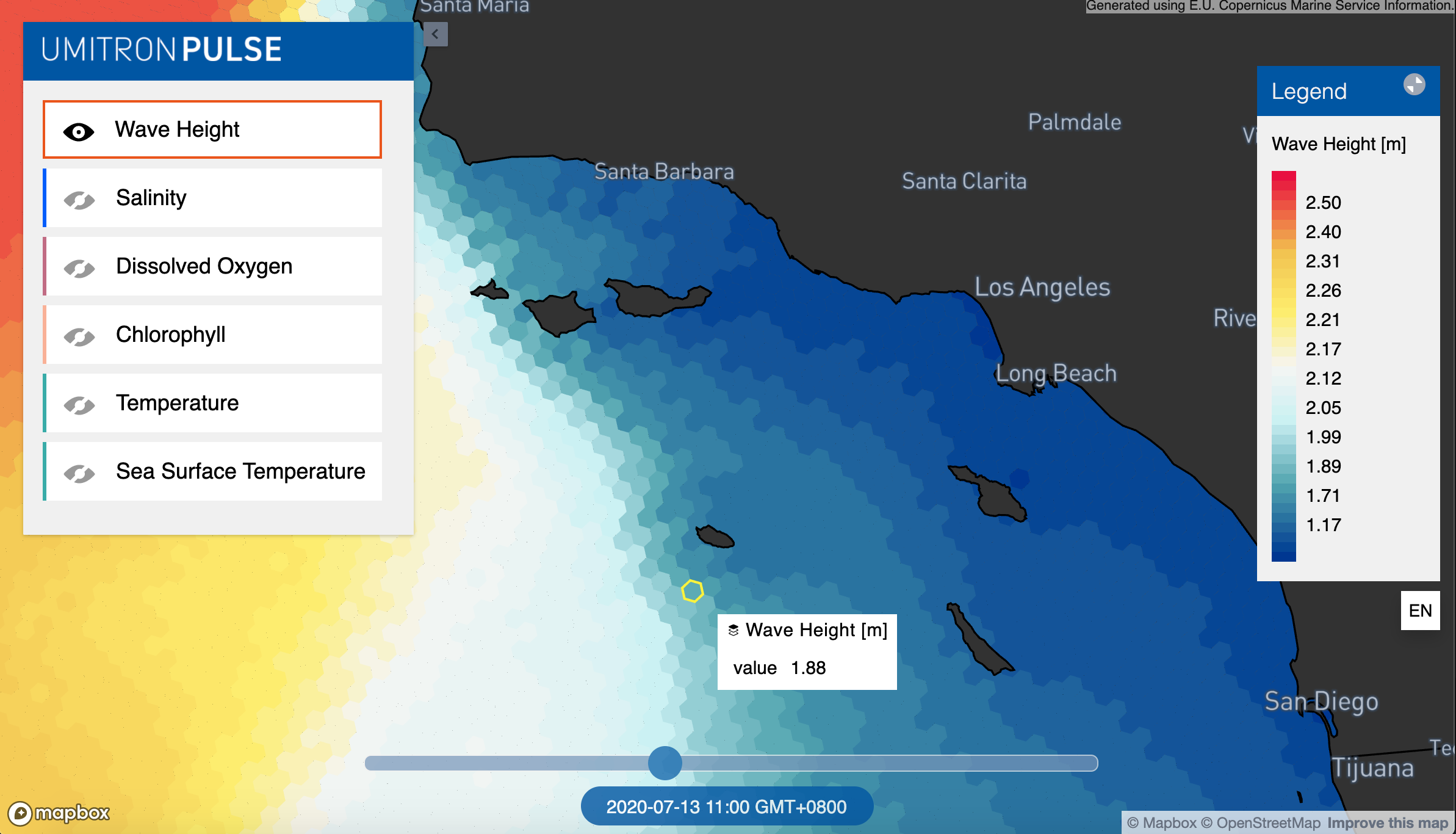 具体的にUMITRON PULSEでは、海水温、塩分、溶存酸素、クロロフィル濃度、波高の海洋データを提供。高解像度データなので、画面内で拡大・縮小することで、局所的なデータと広範囲データを容易に確認できるのが特徴だ。当日の海洋データはもちろん、48時間以内の海洋環境変化を予測する機能も提供する。近日中には、海洋環境データ種類の増加、各種データの毎時更新、過去の海洋データとの比較分析機能も実装される。モバイル版アプリも目下開発中とのこと。