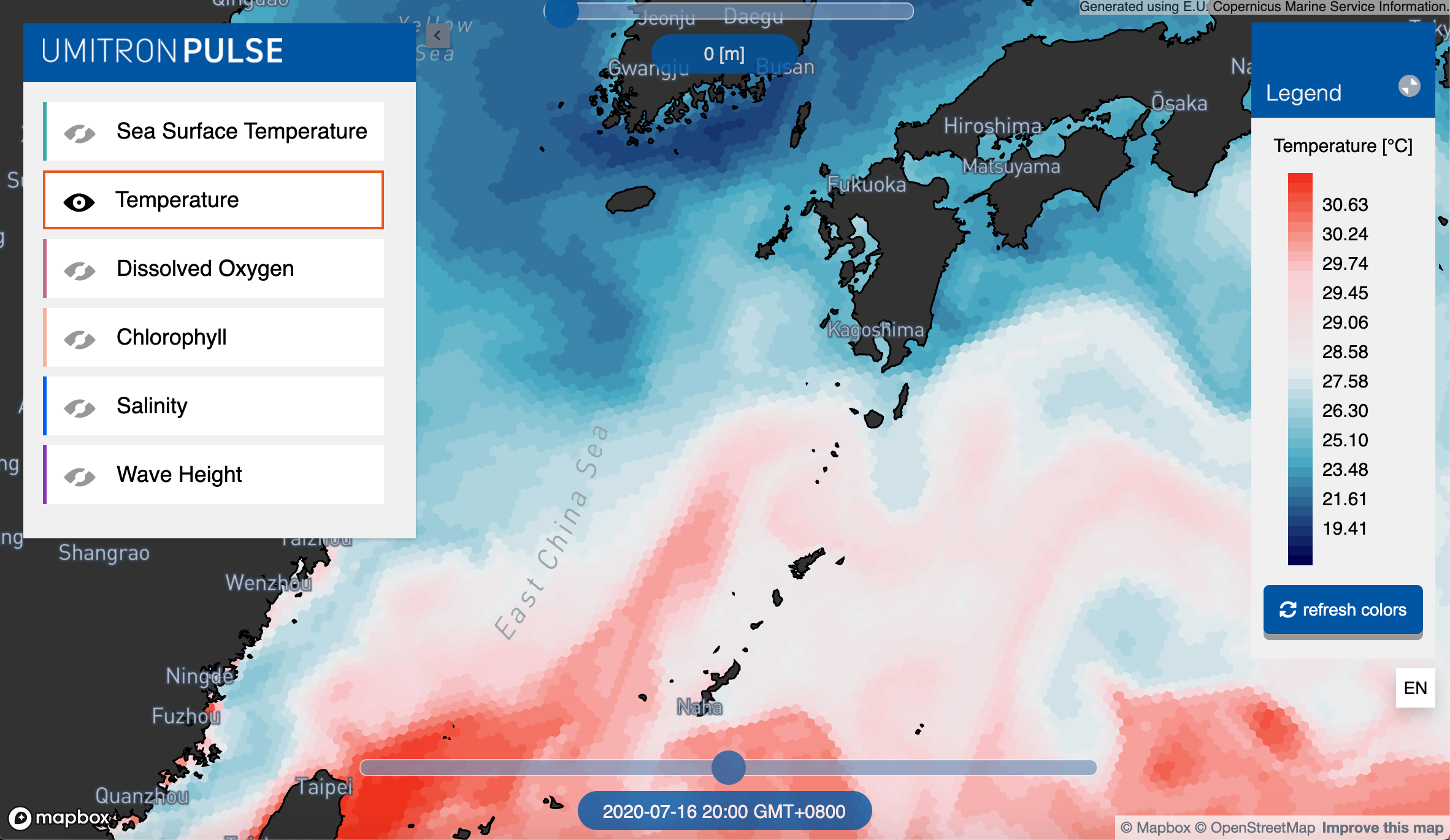 IoT機器などを駆使して養殖産業のディスラプトを推進しているシンガポール拠点のウミトロン(UMITRON)は7月28日、ウェブ上で海洋環境データを可視化する「UMITRON PULSE」(ウミトロンパルス)の提供を開始した。衛星リモートセンシング技術を活用し、世界中のさまざまなエリアの海洋データを高解像度で日次確認できるようになる。
