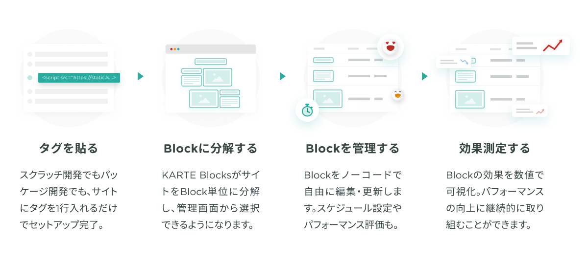 KARTE Blocksは、タグを1行追加するだけで、サイトのあらゆる構成要素をブロックとして分割。CMSで構築されたか、スクラッチで開発されたかを問わず、どんなサイトでもKARTE Blocksの管理画面からブロックごとの編集や、更新スケジュール設定、公開・非公開の設定ができる。また、閲覧数・クリック数・コンバージョン率など、ブロックごとのパフォーマンスの可視化も可能。プレイドではこのツールの概念を「BMS(Block Management System:ブロック管理システム)」と呼んでいる。