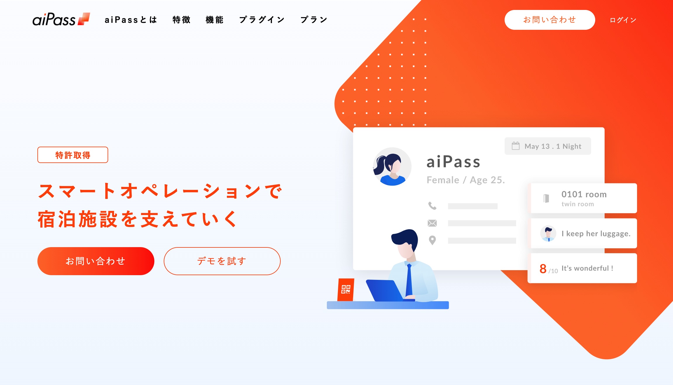 旅行者のスマートフォンを活用した宿泊施設向けサービス「aiPass」を開発。予約確認メールのほか、ホテル設置のQRコードを読み込むことチェックインが可能。ルームサービスやチェックアウトも旅行者のスマートフォンを使え、すべてを一元管理できるのが特徴だ。aiPassはプラグインで拡張できる仕様になっており、導入する宿泊施設別に機能を追加することもできる。コロナ禍のいま、非対面・非接触・三密回避というメリットがある。クイッキンは、福岡市と福岡地域戦略推進協議会が実施する実証実験プロジェクト「福岡市実証実験フルサポート事業」にも採択されている。