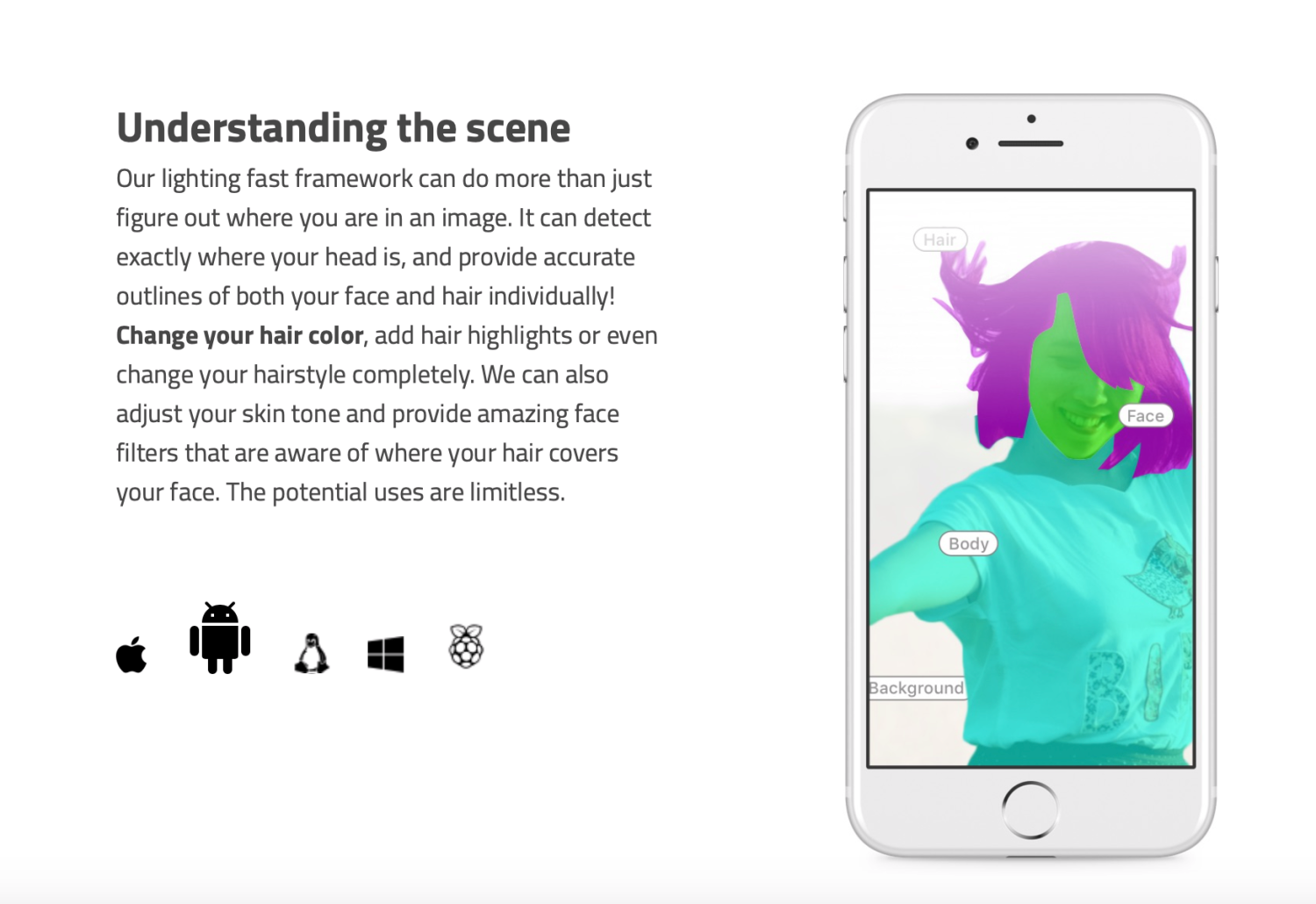 Cameraiの技術には以下の機能が含まれている。画像内のさまざまなオブジェクトを検出し、その輪郭を正確に描き外観を変える機能。画像全体に輪郭を描きフィルターを適用する機能。人間の写真に重ねてリアルタイムで体の関節を検出・描画する「スケルトントラッキング」ニューラルネットワークAPI。進化したポートレートモード用の独自の焦点選択機能(2018年当時は携帯電話に標準装備されていなかった)。Cameraiのサイトはもう閉鎖されているが、インターネットアーカイブから拾ったウェブサイトのスクリーンショットを下に掲載した。