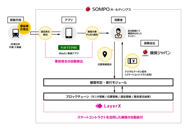 具体的には、保険事故発生に「電車の運行遅延」を保険金請求事由として見立て、ブロックチェーン上でプログラムを自動的に実行できるスマートコントラクトの仕組みを活用し、保険金支払業務を自動化する。