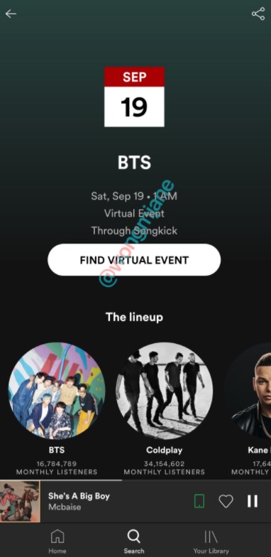 新機能をとらえたウォン氏の写真には、韓国の人気アーティスト「BTS」のSpotifyプロフィールページが写っていて、そこには新しい「今後のバーチャルイベント」セクションがある。イベントをタップすると、ファンはBTSが9月19日にバーチャルイベントに登場するとの情報を得られる。ここでのイベントはBTSが公演することになっている2020 iHeartRadio Music Festival(iHeart Radioプレスリリース)だ。。写真では、このイベントのチケット取り扱いパートナーはSongkickとなっている。
