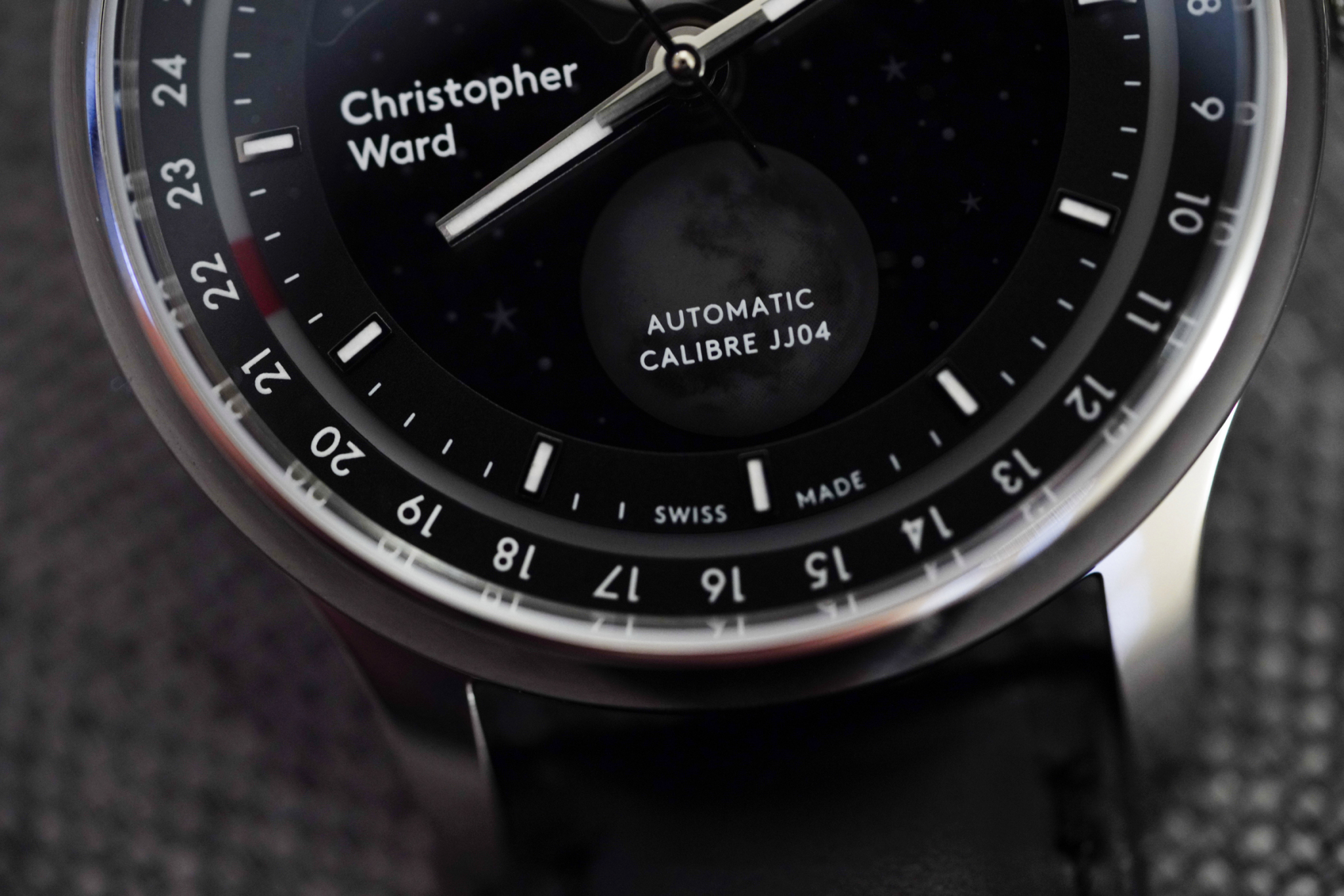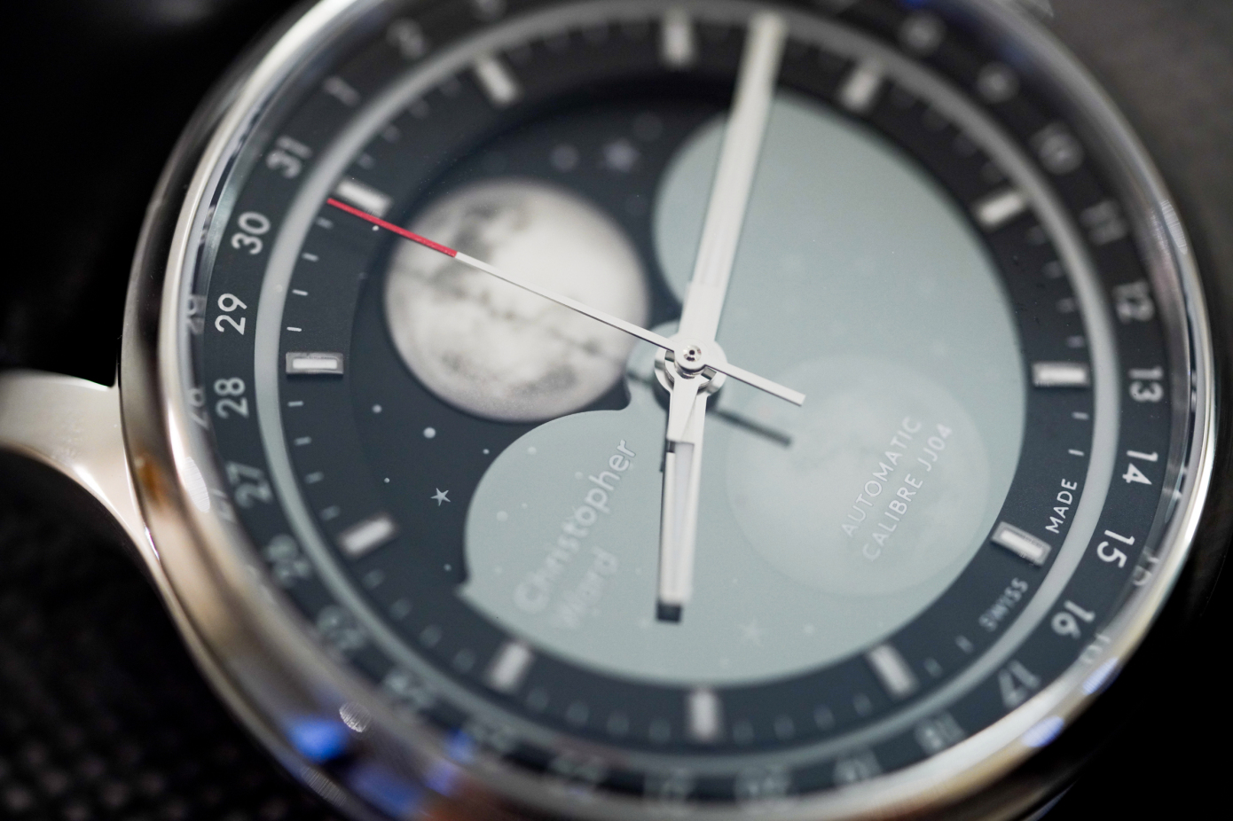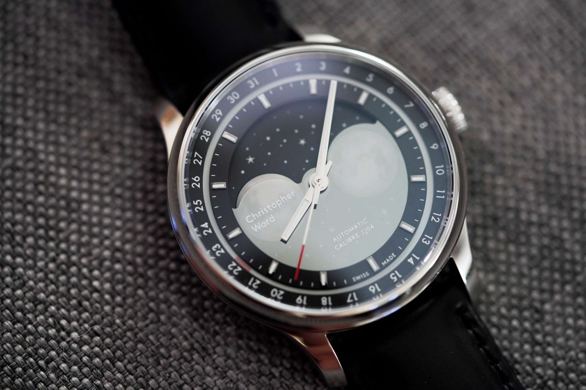 ムーンフェイズの設定は非常に簡単で、リューズを2番目の位置まで引き出して反時計回りに回すことで完了する。時計回りに回すと日付を設定できるが、両方を独立して調整が可能だ。また、時間も独立して調整できる。フェーズを正確にするのは少し難しいかもしれないが、Christopher Wardが付属のマニュアルで簡単な手順を説明している。あるいは、Watchvilleのようなサードパーティーアプリを使うこともできる。このアプリは、アナログを設定するためのムーンフェイズを備えており、非常に正確な仮想ウォッチフェイスを作れるのだ。