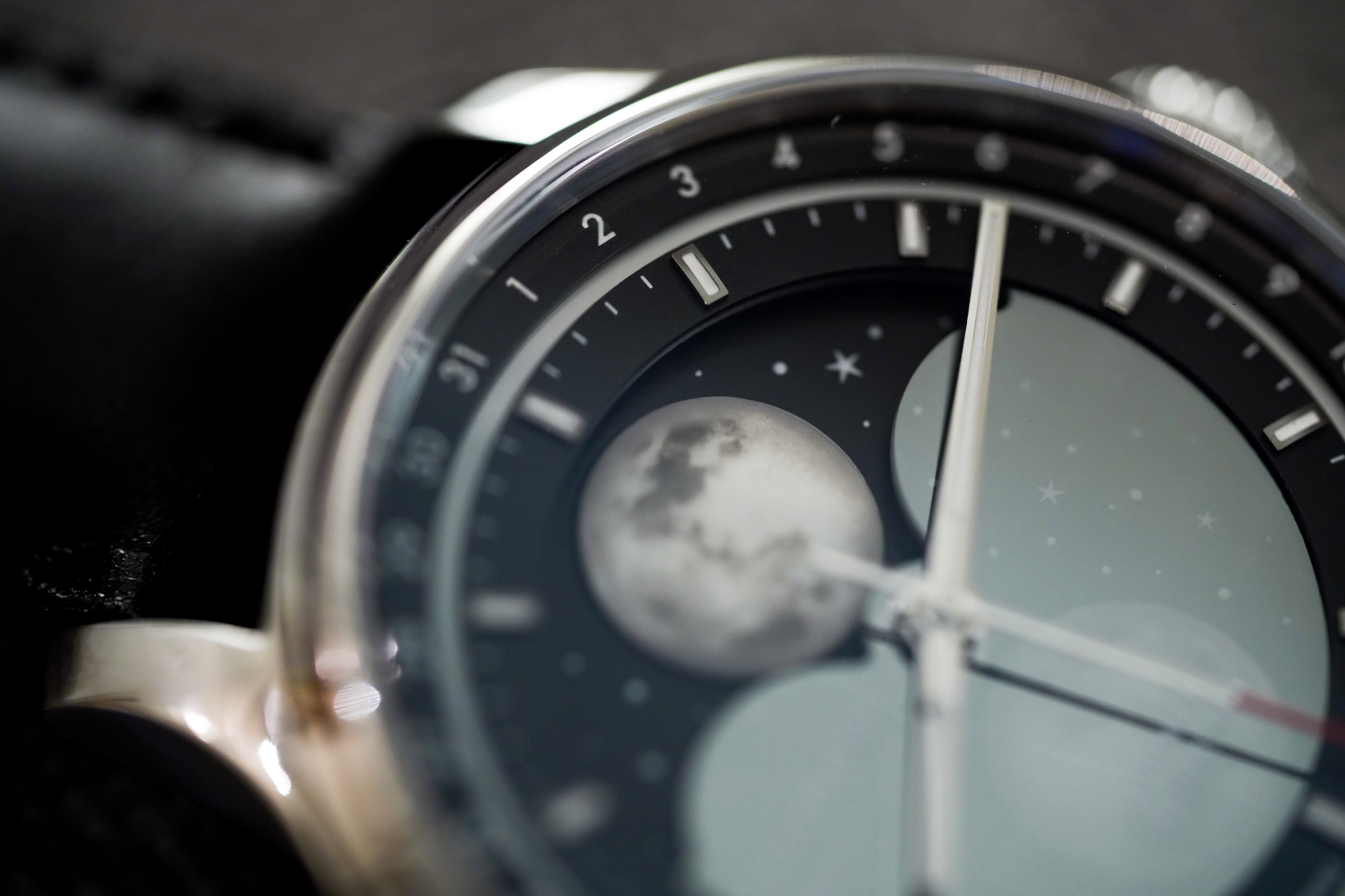 ムーンフェイズ表示の文字盤には星が散りばめられており、高級感と洗練された雰囲気を保ちながらも、どこか遊び心を感じることができる。時計の針や時針、日付の指輪、星にも光が当たる。これらのすべての層を積み重ねつつ、文字盤の表面の質感、日付の文字盤との間に施された白い縁取りリングなどがこの時計に素晴らしい深みを与えている。それでいて40.5mmの大きさと12mmをわずかに超える高さで、分厚くも大きくもない腕時計である。