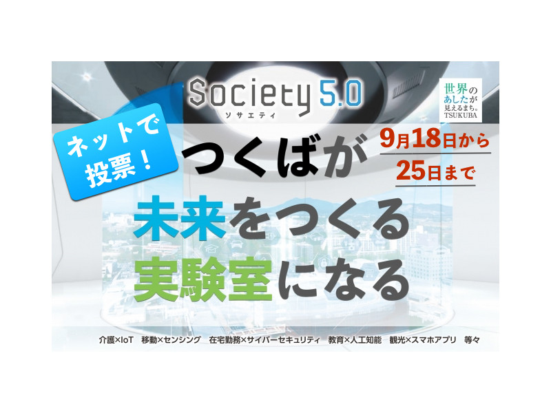 つくば市は、平成29年度(2017年度)から「Society 5.0」の実現を目指し、革新的な技術やアイデアで社会課題を解決する、Society 5.0の社会実装に向けたトライアル(実証実験)事業案を全国から公募し、採択事業を支援している。