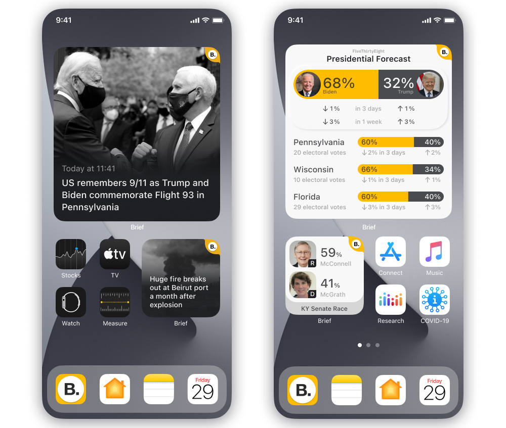 偏りのないニュースアプリを標榜する「Brief」は、クリックベイト(煽り見出し)を避けるという約束(未訳記事)を守っており、注意力の分散を防ぐためにデザインされたミニマルな単色のウィジェットを使用している。「フロントページ」ウィジェットのコンテンツは、ニュースチームによって注意深くキュレーションされるため、その日の最も重要なニュースのみがホーム画面に表示される。