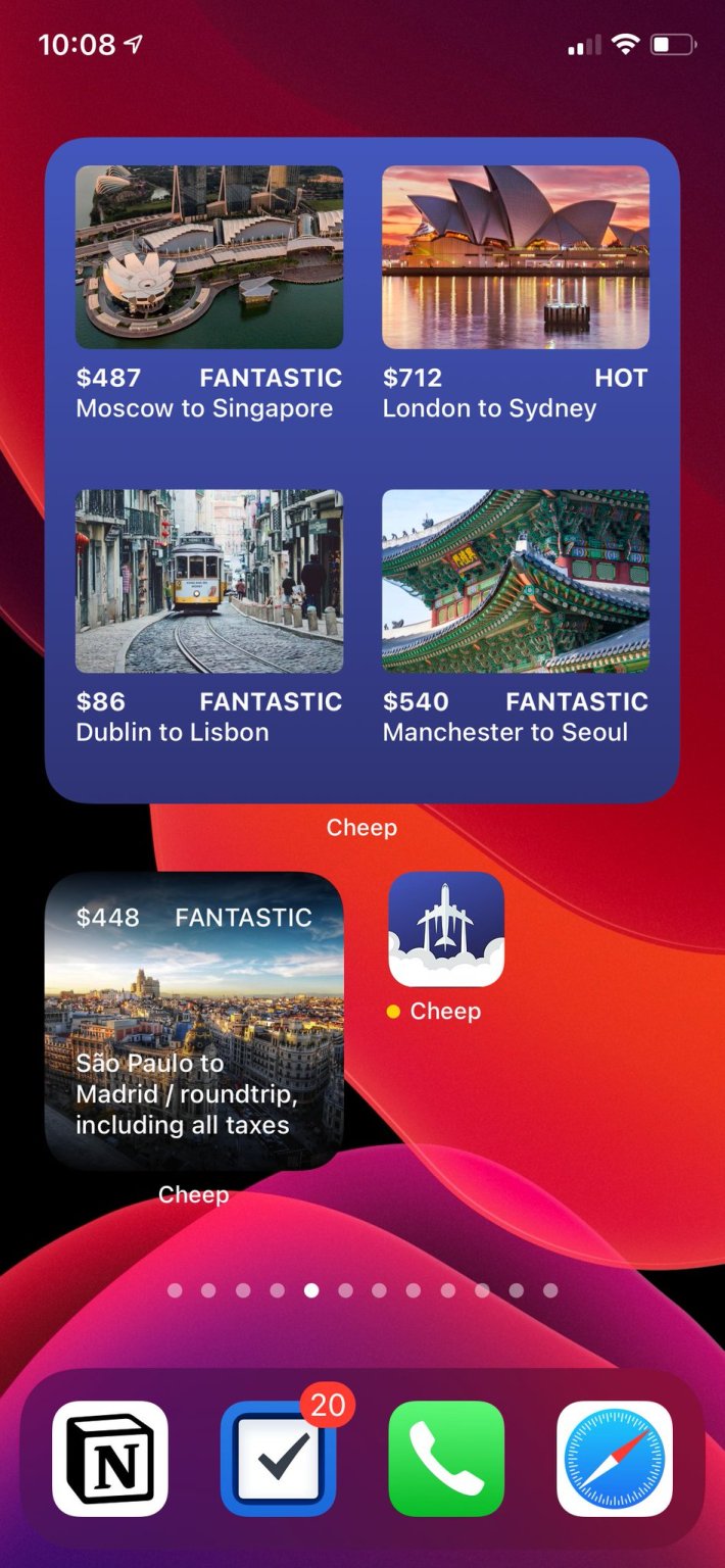 Cheepアプリを使えば、間違った運賃やその他のとんでもなく割引されたフライトのお得な情報を知ることができる。iOS 14ウィジェットは、あなたの空港のお得な情報をだけをカスタマイズ可能で、アプリを開かなくても簡単にお得な情報を入手できる。