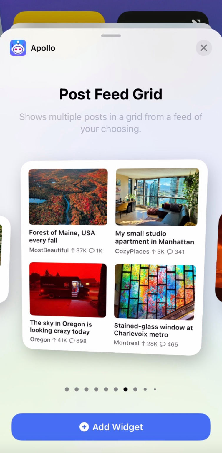 人気のRedditクライアントアプリのApolloは、選択したRedditフィードからの投稿を表示する「Post」、お気に入りのフィードから複数の投稿を表示する「Multiple Posts」、よりビジュアルでグリッドスタイルのレイアウトで投稿を表示する「Post Feed Grid」、画像が多いSubreddits(Redditのサブフォーラム)の写真を順番に表示する「Wallpaper」、ホーム画面にちょっとしたユーモアを添える「Showerthoughts」「Jokes」など、さままなウィジェットのコレクションを提供する。