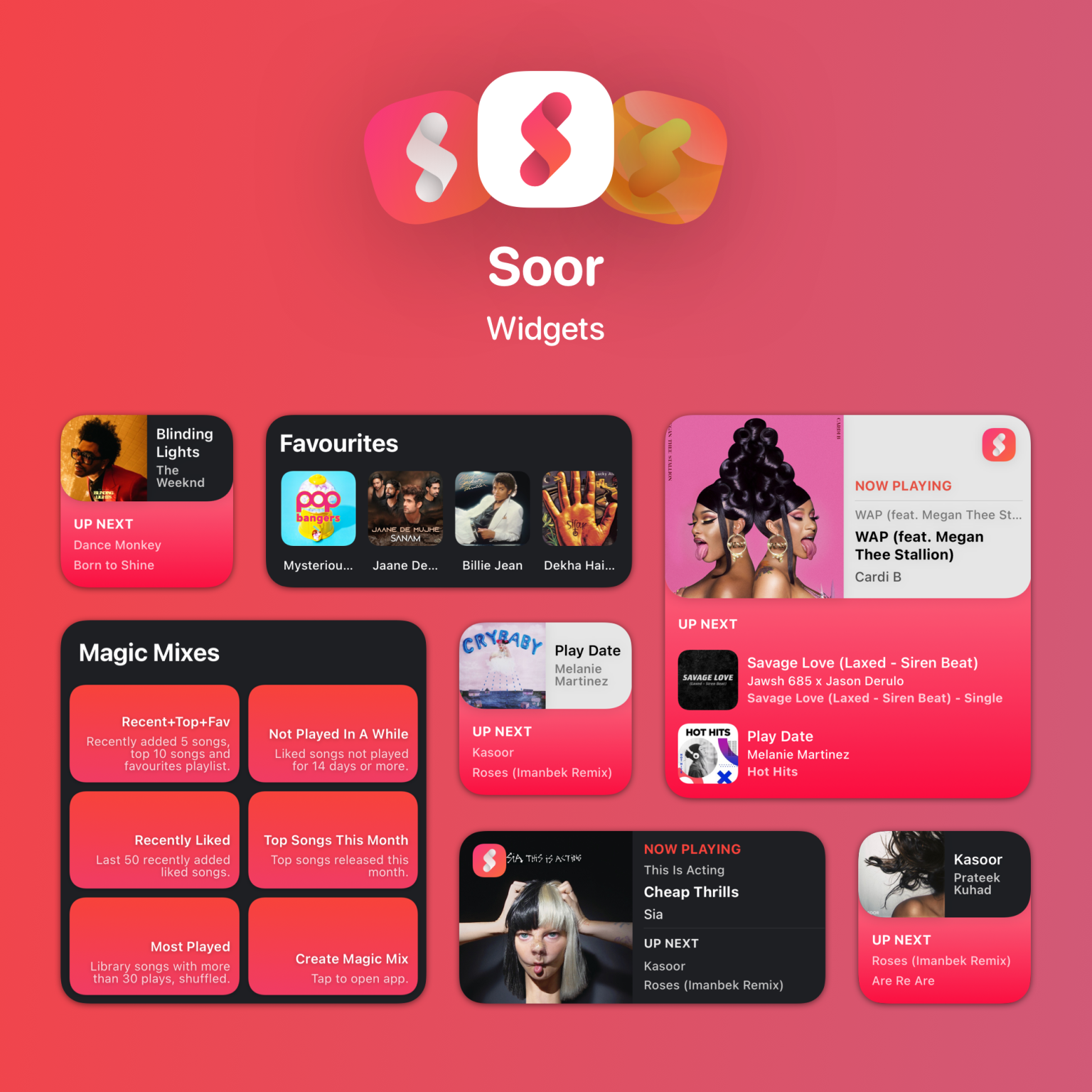 iPhoneユーザー向けのプレミアム音楽プレーヤーアプリ「Soor」が、大小3つのウィジェットをリリース。「Now Playing」ウィジェットは、現在の曲と次の曲が表示され、ほぼリアルタイムで更新される。また、自分のミックスを表示する「Magic Mixes」ウィジェットや、8種類のキュレーションされたコンテンツを表示設定できる「Music Collection」ウィジェットも用意されている。