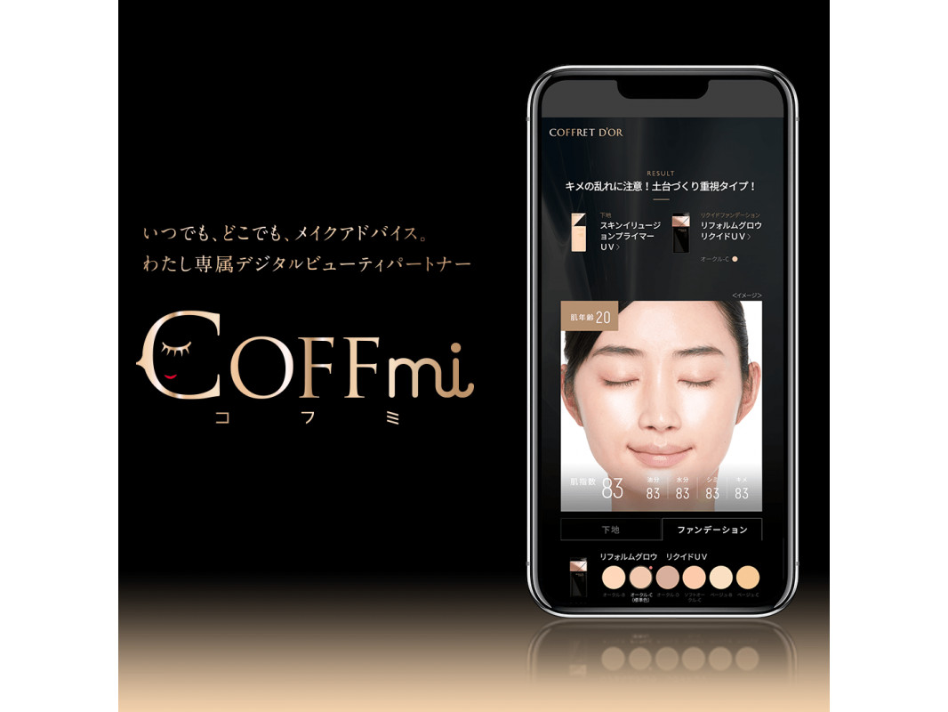 COFFmiは、デジタルメイクカウンセリングをが可能なデジタルサービス。主機能の「COFFmi CHECKER」(コフミチェッカー)は、顔写真を撮影し、簡単なアンケートに答えるだけで、水分・油分・シミ・キメ・顔の特徴を分析し、ユーザーに最適なメイクアイテムと色のアドバイスを実施。約7000通りのメイク分析・提案が可能という。