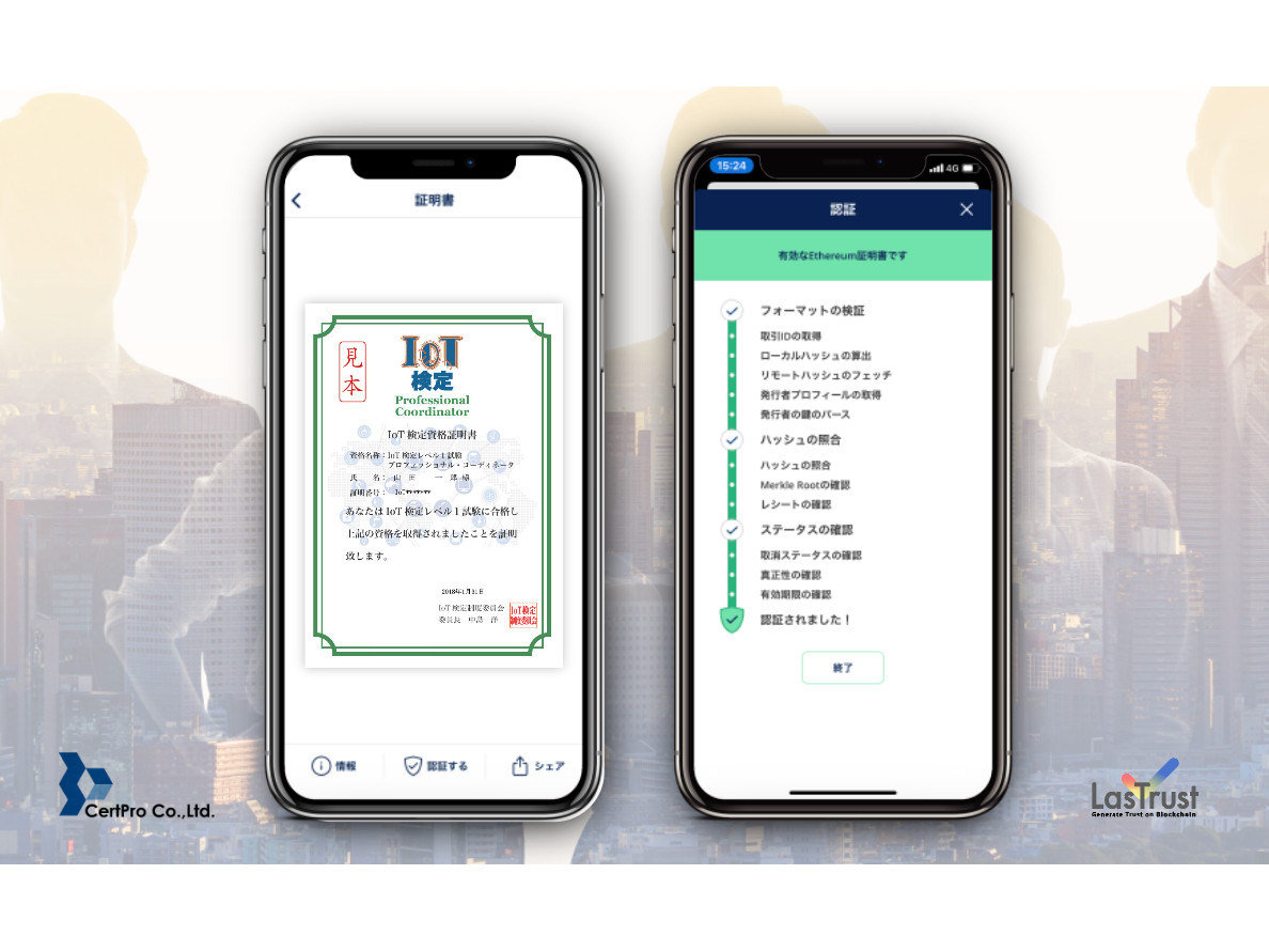 LasTrustの提供しているサービスCloudCertsは、あらゆる「証明」をセキュアにデジタル化できるブロックチェーン証明SaaS(オープンソースのブロックチェーン証明書規格Blockcertsに準拠)。今回のデジタル化実証実験では、サートプロが紙で発行・運用を行っていた資格の数々をデジタル化。合格証を合格者に渡すまでのリードタイムや発行・管理コストの改善、有資格者側の利便性向上を目指し、実証実験を行う。