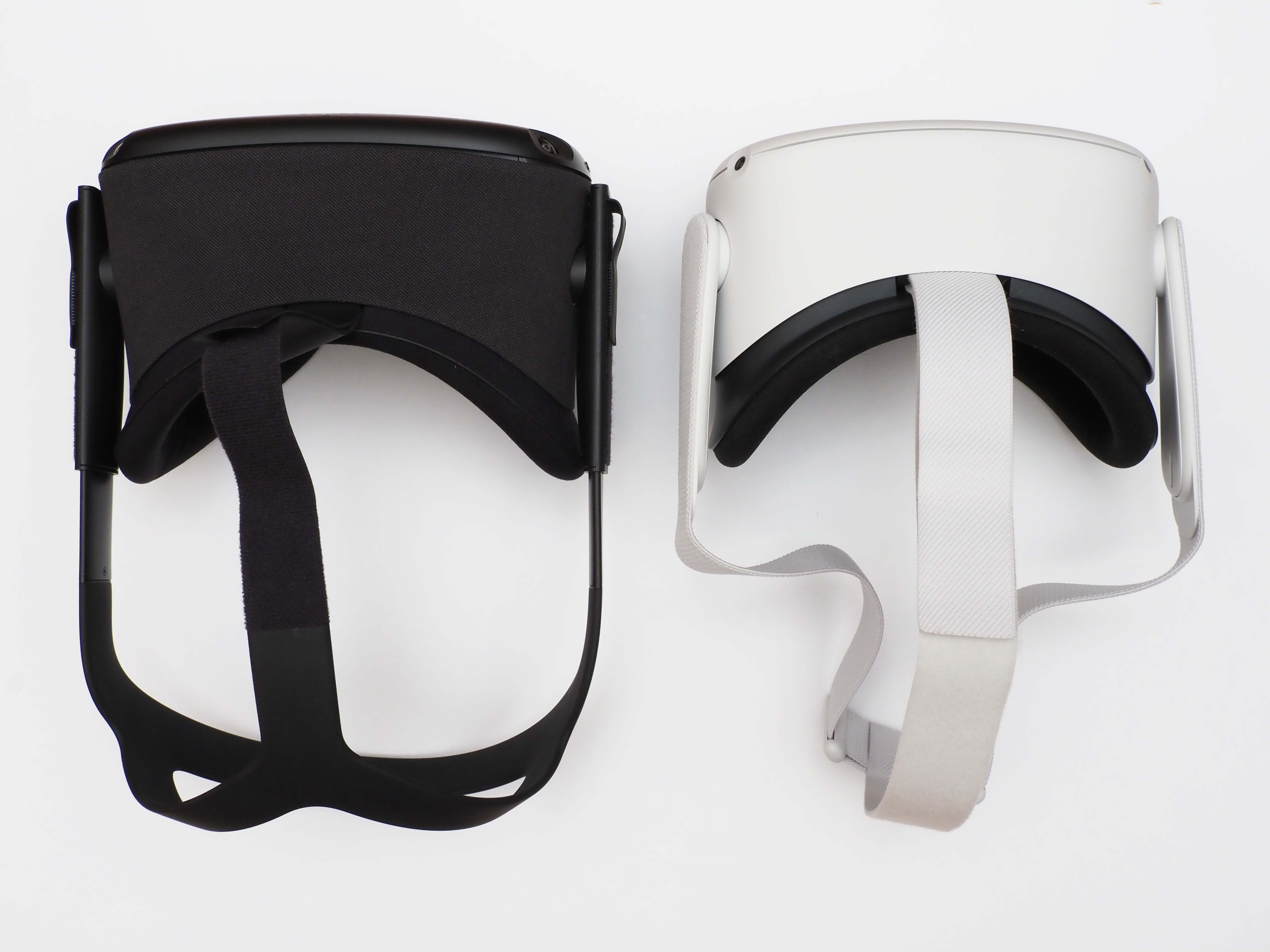 左がOculus Quest、右がOculus Quest 2。並べてみると、ヘッドセットの本体部分がひと回り小さくなっているのがわかる
