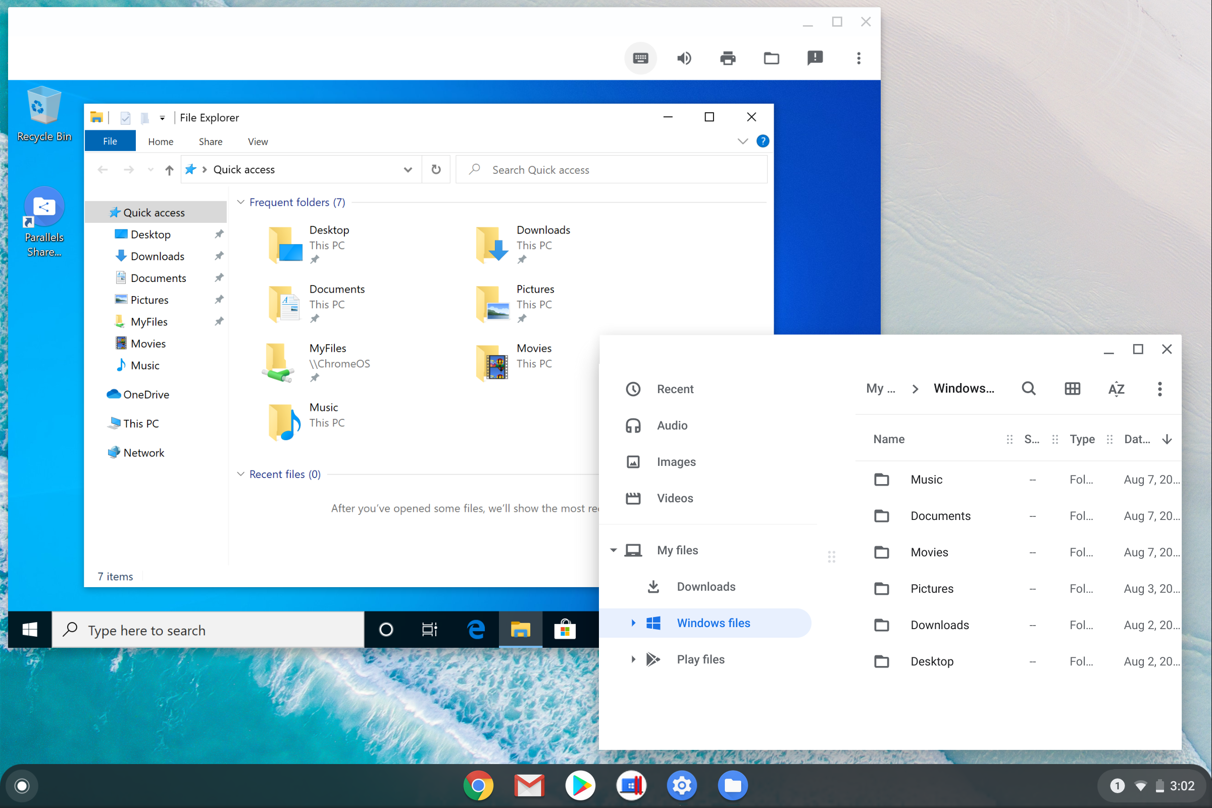 仮想PC環境としての基本的な機能や操作は、Mac版のParallels Desktopを使ったことのある人にとっては、かなり自然なものに感じられるはず。Chrome OSとWindows間でのクリップボードの共有、ユーザーフォルダーの共有、プリンターの共有、Windows画面のダイナミックなリサイズ、フルスクリーンのサポート、リンクやファイルを開くアプリをOSをまたいで設定、Windows環境のサスペンドとリジュームといった機能は、当たり前のように使える。