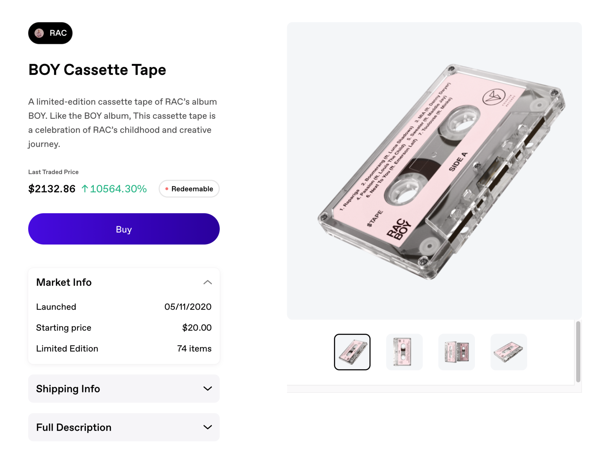 - 価値は通貨に散逸するのではなく、アーティストの世界に留まる。トークンはアーティストがフォロワーにインセンティブ、報酬を与え、活気付かせる役割を果たす。RACのミックステープを購入したファンはトークンを取得し、そのトークンはさらに別のグッズを購入する際に引き換えることができる。