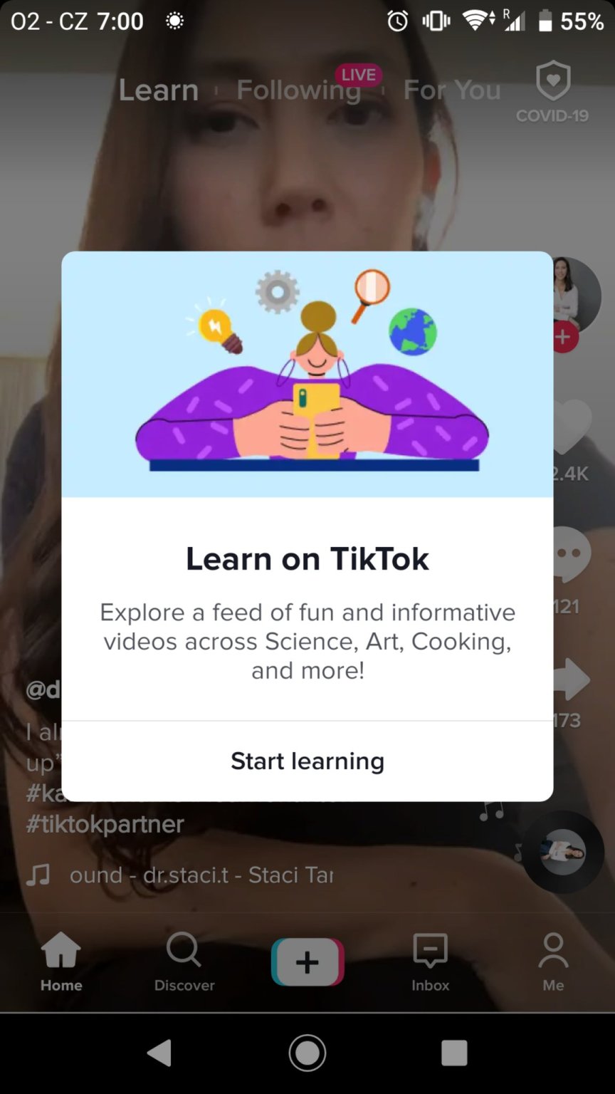 ホームスクリーンのトップにある「For You」と「Following」の横に目立つように位置するLearnについて、TikTokは料理したりアートを制作したり科学のプロセスを説明したりするユーザーが投稿するハウツービデオとお役立ちビデオを見つけられる場所と形容している。