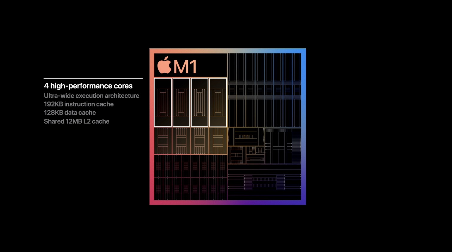 M1はARMチップのスタンダードを踏襲し、4基の高性能コアと4基の高効率コアを搭載される。