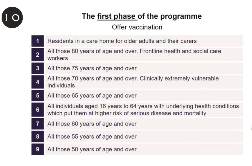 ハンコック氏はワクチン初回分は、ケアする人も含め、ケアホームにいる「最も高齢」の人に優先して接種すると述べた。「そして当然のことながら年齢のレンジを下げていきます。NHSスタッフもまたワクチン接種を優先されるべきリストの上の方にきます。それから健康面で影響を受けやすい人、特にコロナウイルスに対して脆弱である人も優先されます」。