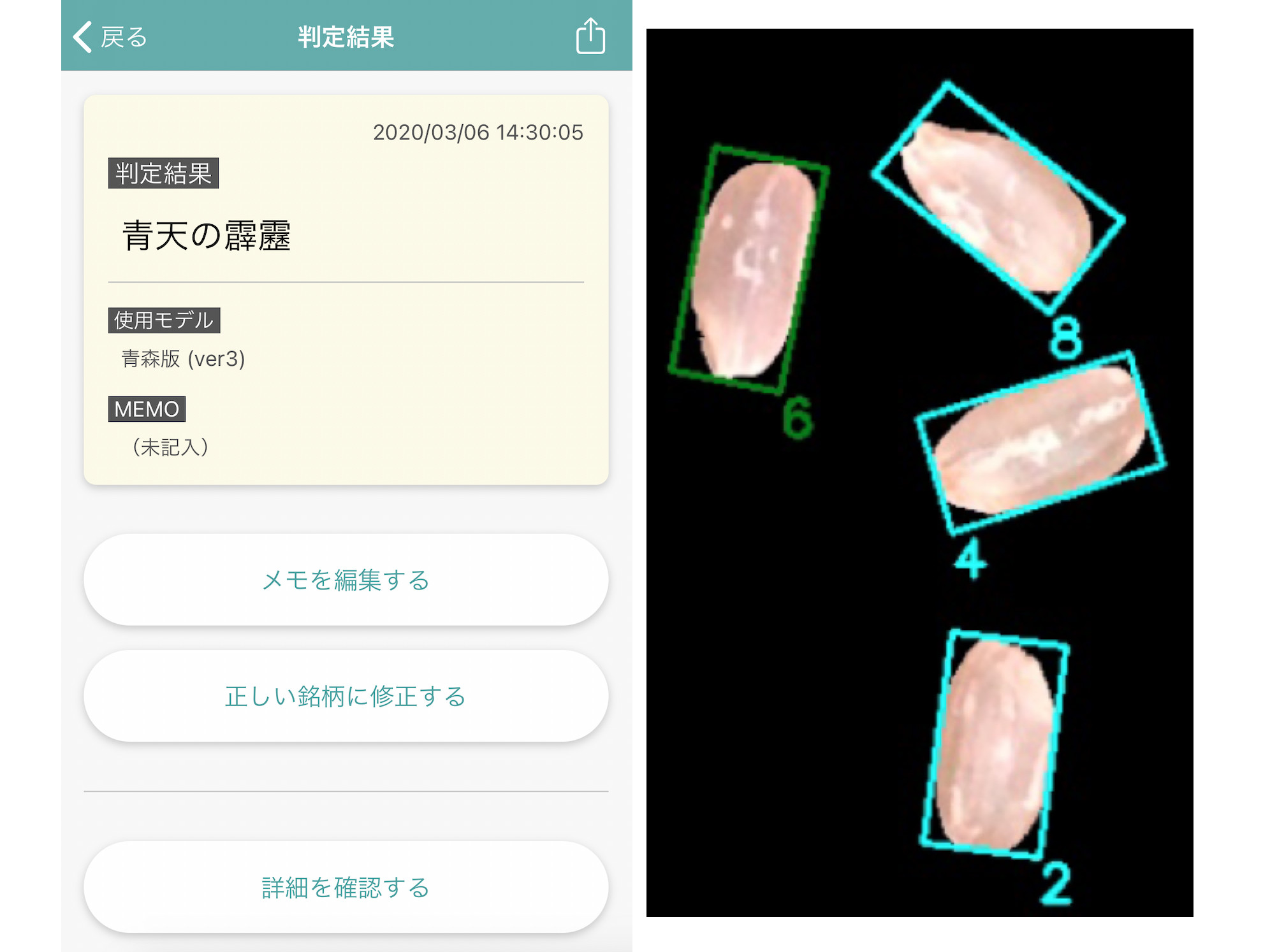 今後は、さらなる精度の向上や判定できる銘柄を増やしていき、検査員の負担を減らすとともに、流通の過程でより正確に銘柄のチェックができるように実用化に向けて開発を進める。
