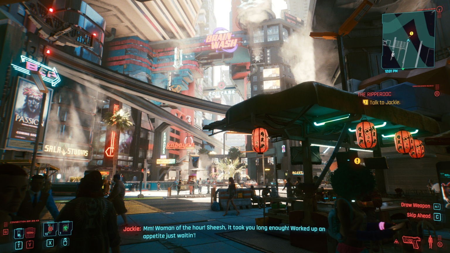 奇妙な未来の人々で埋め尽くされた混雑する通りの外観は、樽でしつらえた肉を提供するフードカートの間を移動し、サイバネティックな手足やハッキングツールのための浮遊するネオン広告の下で、怪しげな意図を持つ巨大企業によって監視されている。