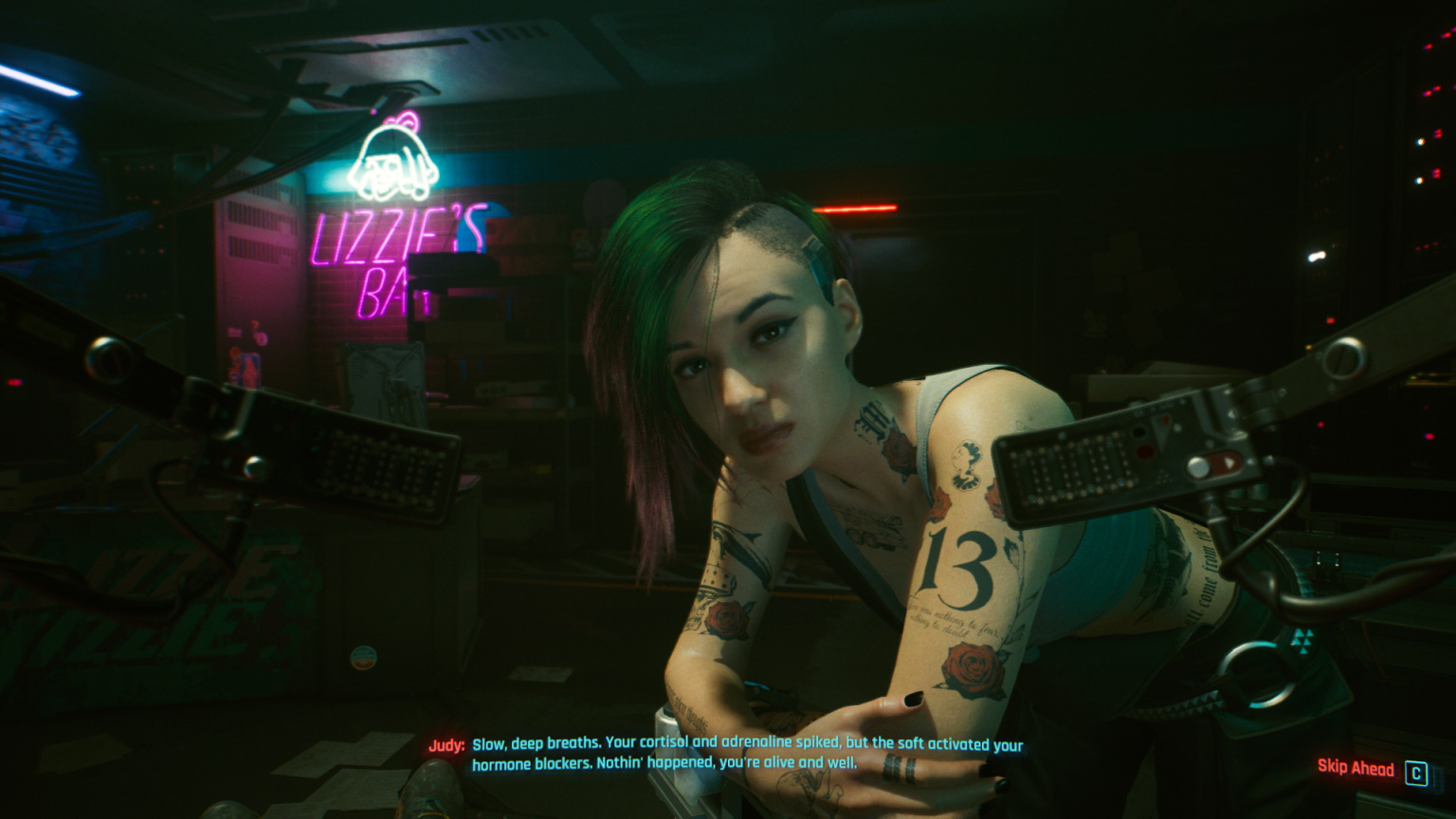 ジェンダーについてもすっきりしない。PolygonとKotakuのクィアレビュアーによるレビューは、筆者がここで伝えることよりもはるかに的を射たことを語っている。筆者はプレイヤーが外見を選択する際に持っている自由は、ゲームにおけるクィアネスのより良い表現に向けた重要な一歩であるものの、「自分がするようにではなく、自分がいうようにする」という感覚がある、ということには同意することができる。ゲームの別の場所では、性とジェンダーは、街角で数ユーロで誰でも身体改造できるこの世界では人種と性別は流動的で重要ではないという明確な合意に対し、退行的または矛盾した形で処理される。