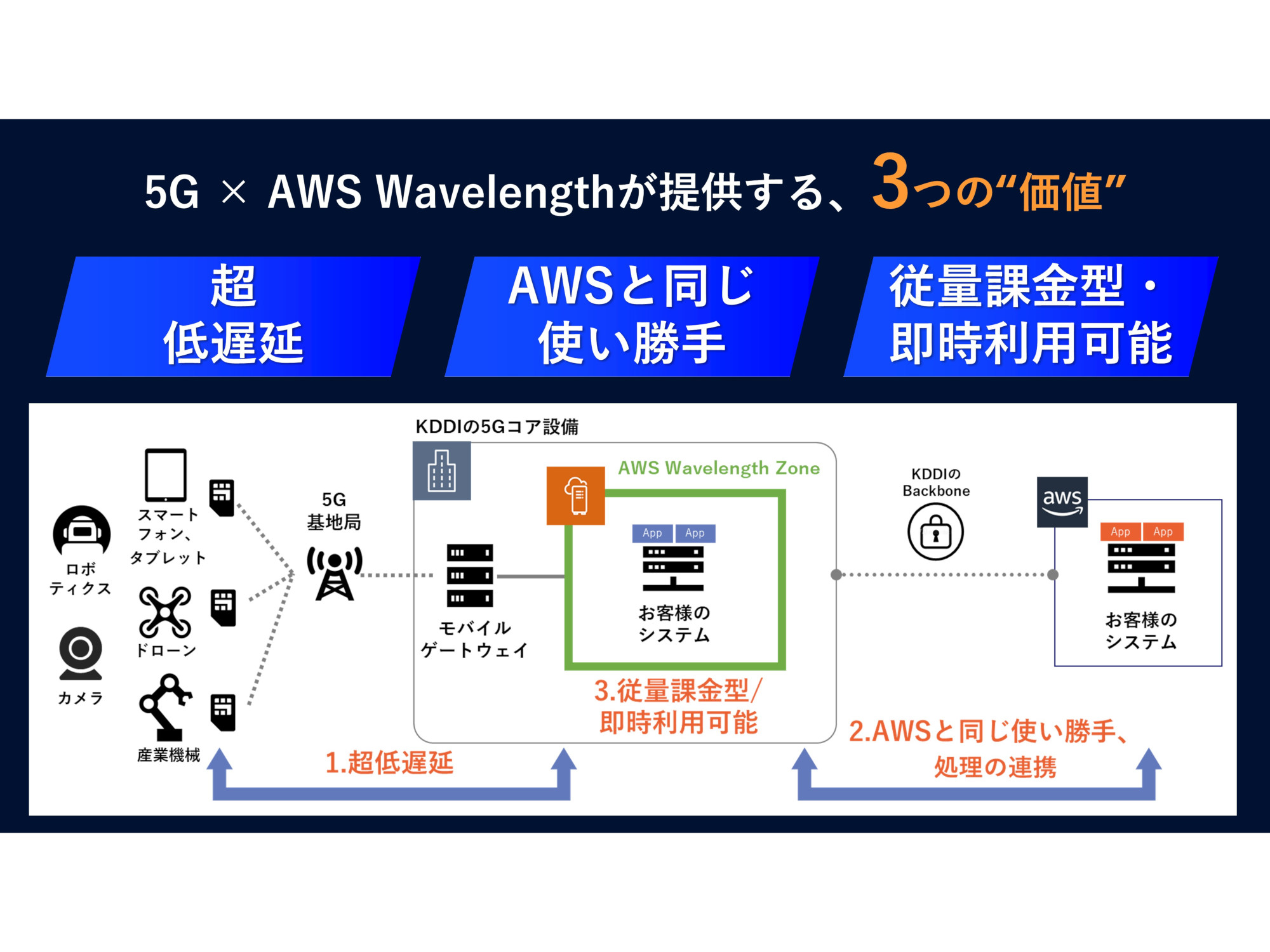 KDDIは12月16日、AWS(Amazon Web Services)とともに、au 5Gネットワーク内で、モバイル端末やエンドユーザー向けに超低遅延アプリケーションの構築を可能にするAWSインフラストラクチャーサービス「AWS Wavelength」を東京で提供開始すると発表した。